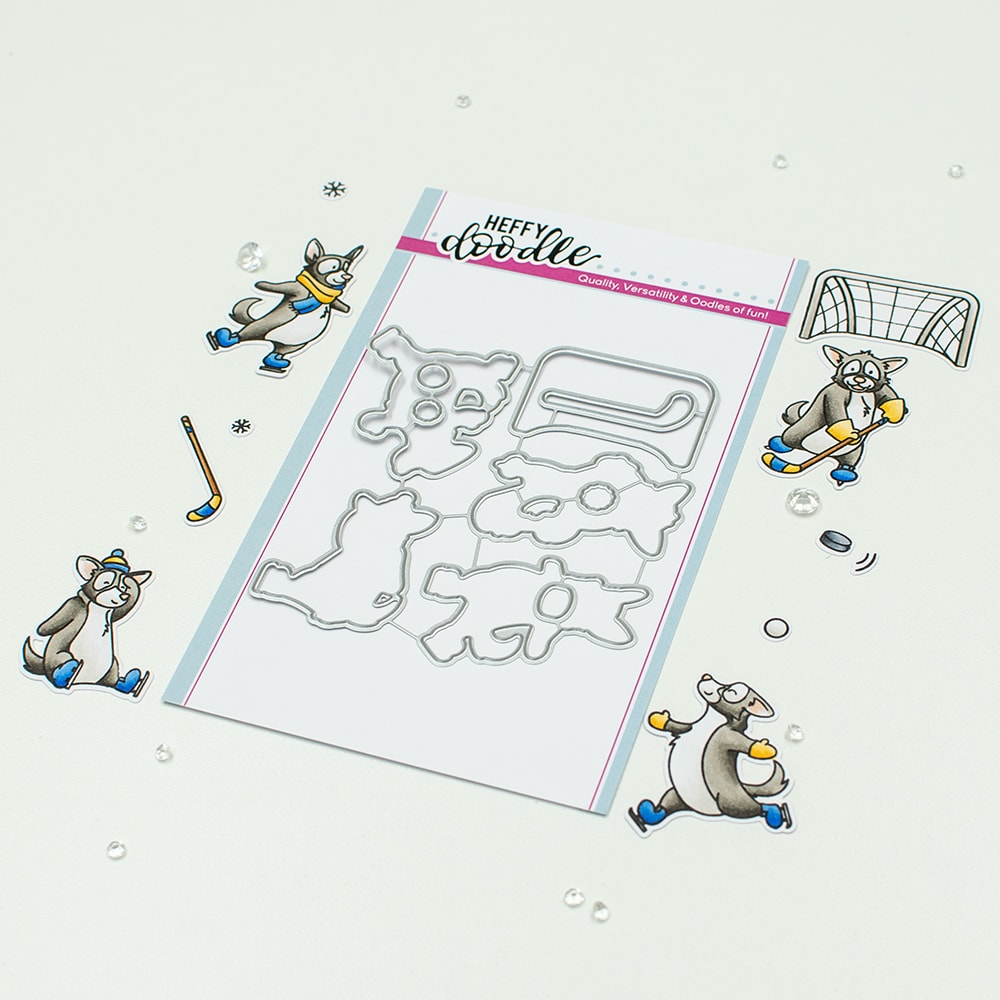 This set of 11 dies coordinates with the Ice Pups Stamps (HFD0510). This product contains dies for a puck, a dog on ice skates wearing a scarf, a dog with a hockey stick, a goal post, two snowflakes, a hockey stick, motion lines, a snow ball, a sitting dog with a winter hat, and a jumping ice skater pooch.