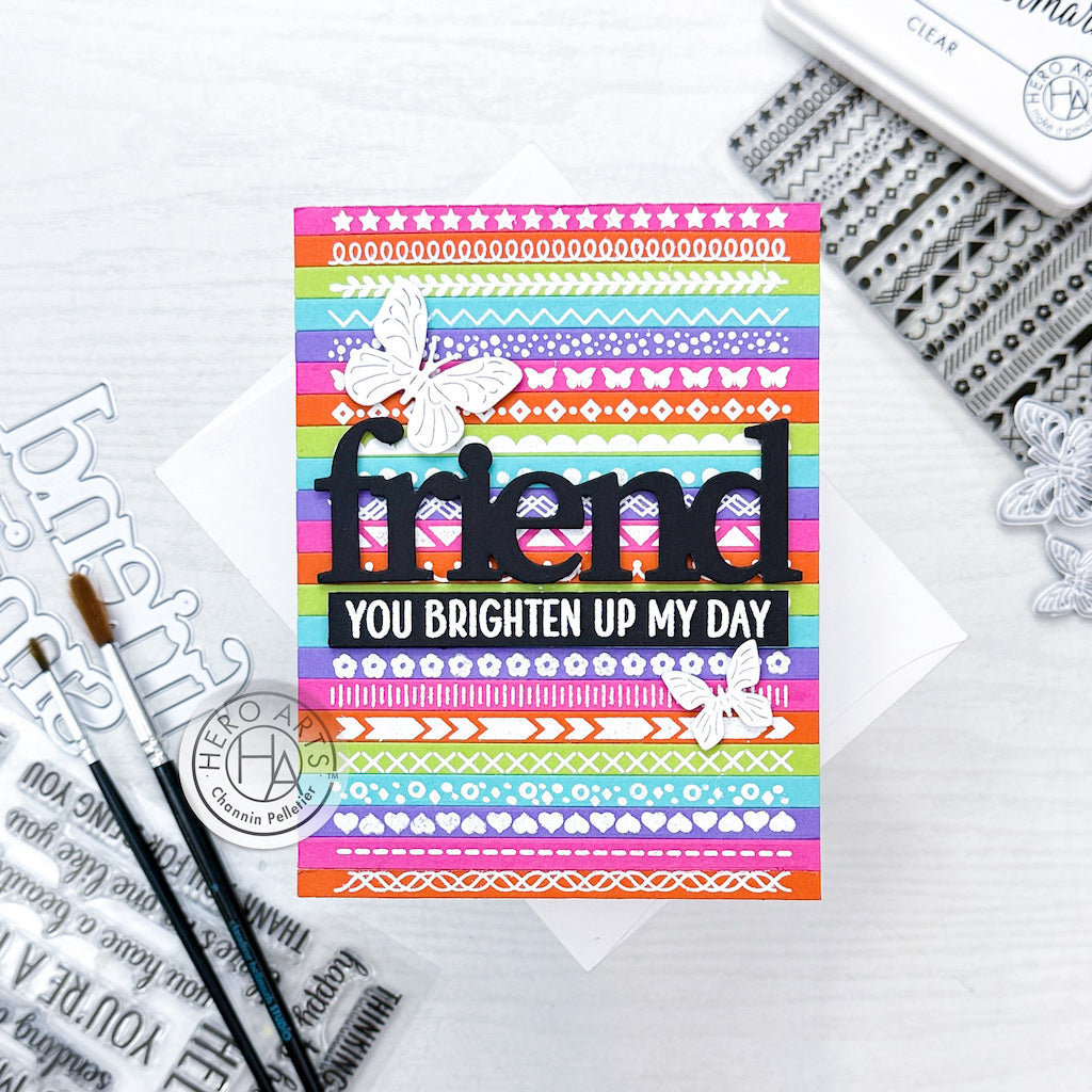 Introducing the Decorative Strips Clear Stamp Set from Hero Arts! Hero's top-quality 4 x 6 inch clear stamp sets are proudly made in the USA from genuine photopolymer. This material is non-toxic, biodegradable, and ensures beautiful ink transfer to paper, delivering a true impression every time. Simply peel the stamp from its backing and adhere it to an acrylic block for convenient positioning. Mix and match the versatile designs to create stunning compositions. Cleaning up is effortless with water or stamp cleaner.