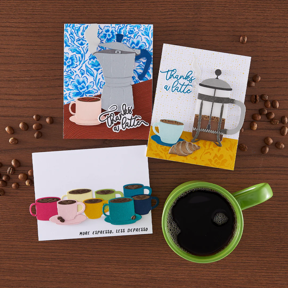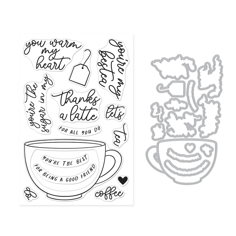 Hero Arts Coffee or Tea Clear Stamp and Die Set includes 14 stamps on a 4 x 6 inch sheet and coordinating dies to create a large mug, tea bag, and layered sentiments. Mix and match four large script sentiments, sub-sentiments, and words to personalize your design. Perfect for coffee or tea lovers alike. Stamps are made in the USA from high-quality photopolymer; dies are compatible with most die-cutting machines.