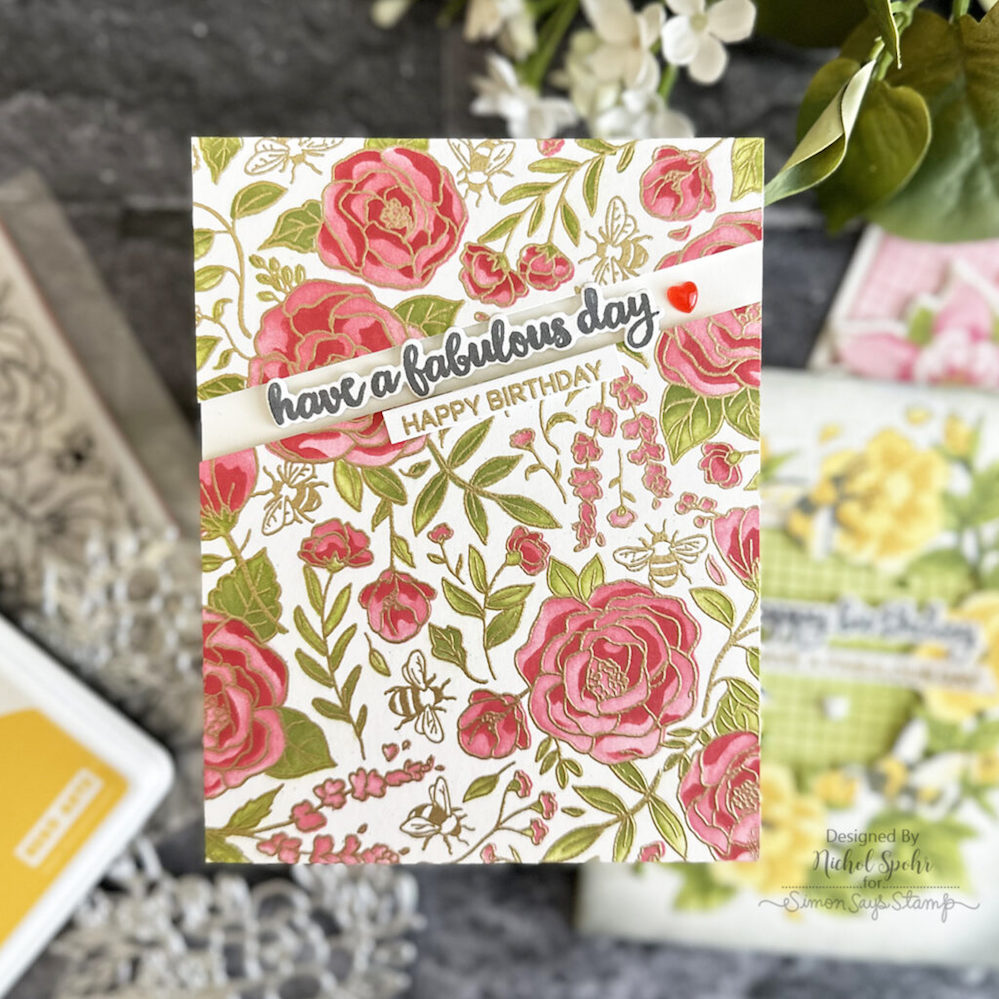 A set of three 6 x 6 inch stencils to create a background of roses being visited by sweet little bees.
