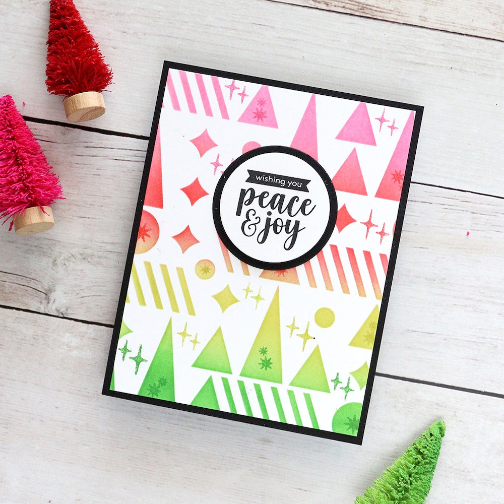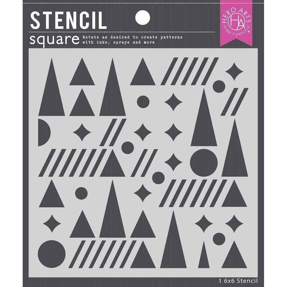 Introducing the Hero Arts Joyful Geometric Holiday Stencil. Measuring 6 x 6 inches, this laser-cut stencil is made from thick frosted mylar for durability. Perfect for adding festive geometric designs to your projects, it can be used with a paintbrush, ink pad, dauber, or spray to transfer the pattern onto your favorite media. Made in the USA, this stencil is ideal for enhancing your holiday crafts with precision and style.