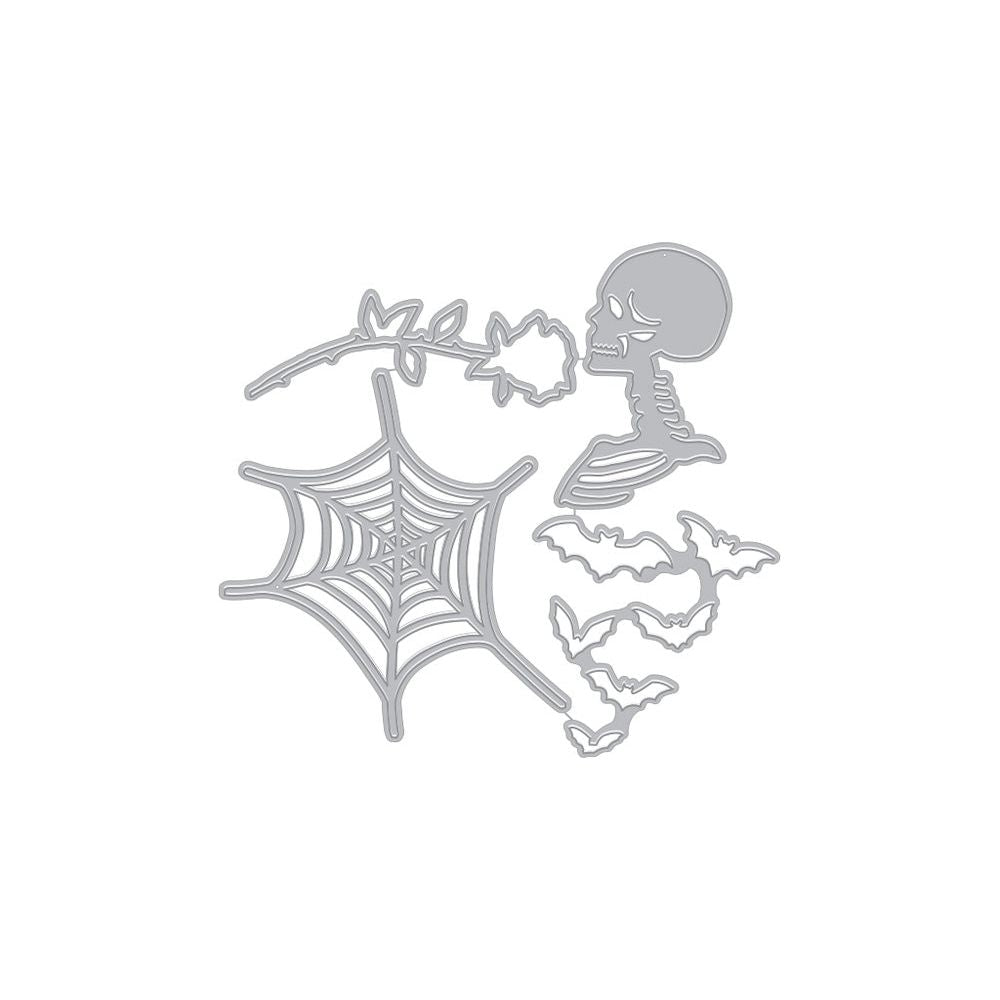 The set includes a skeleton measuring 1.13 x 2 inches, a spiderweb measuring 2.5 x 2.75 inches, and a rose measuring 0.75 x 2.38 inches.