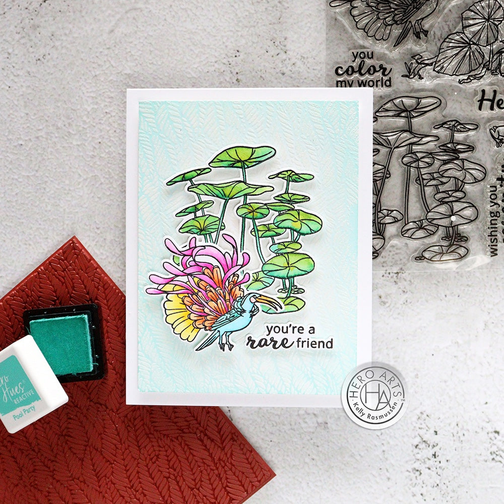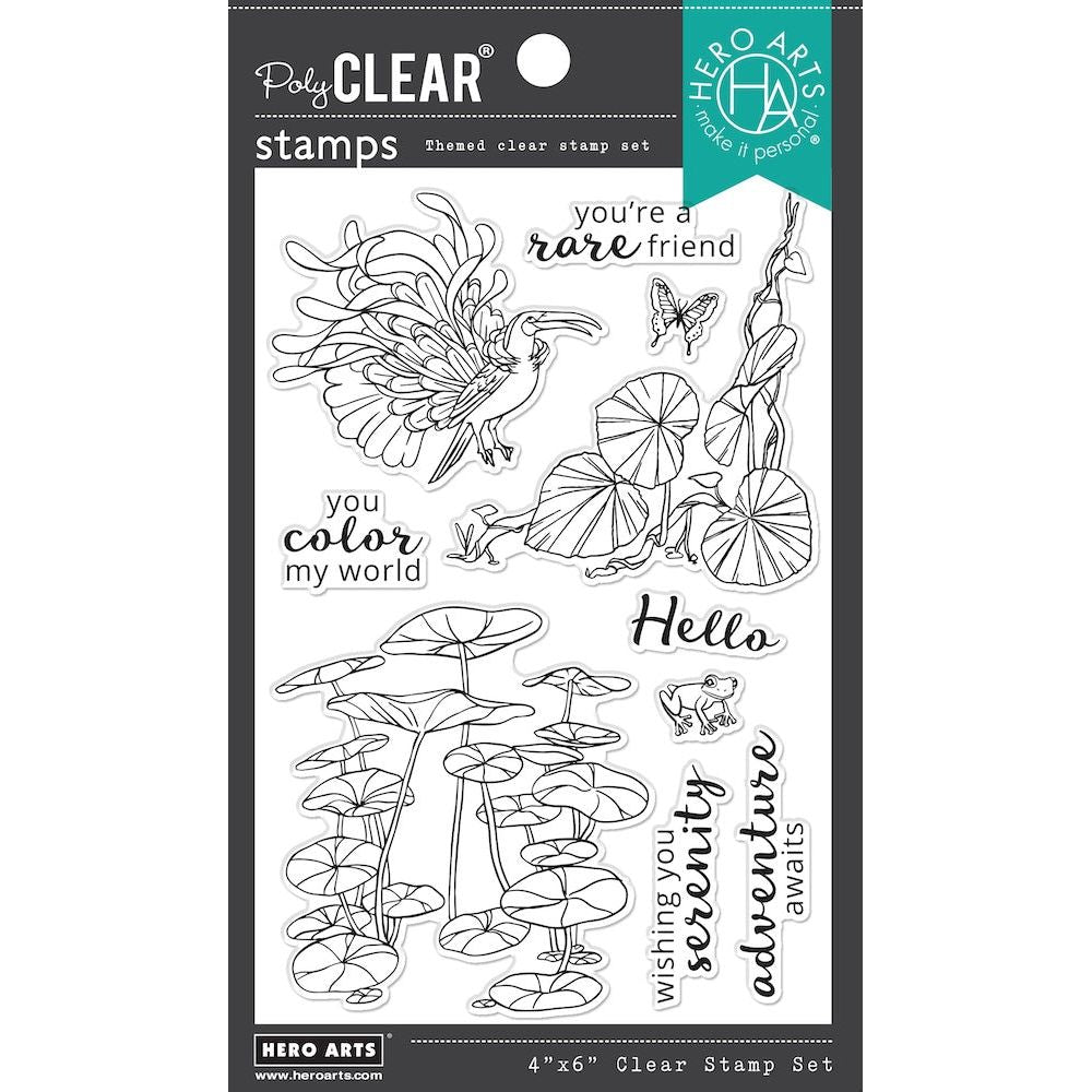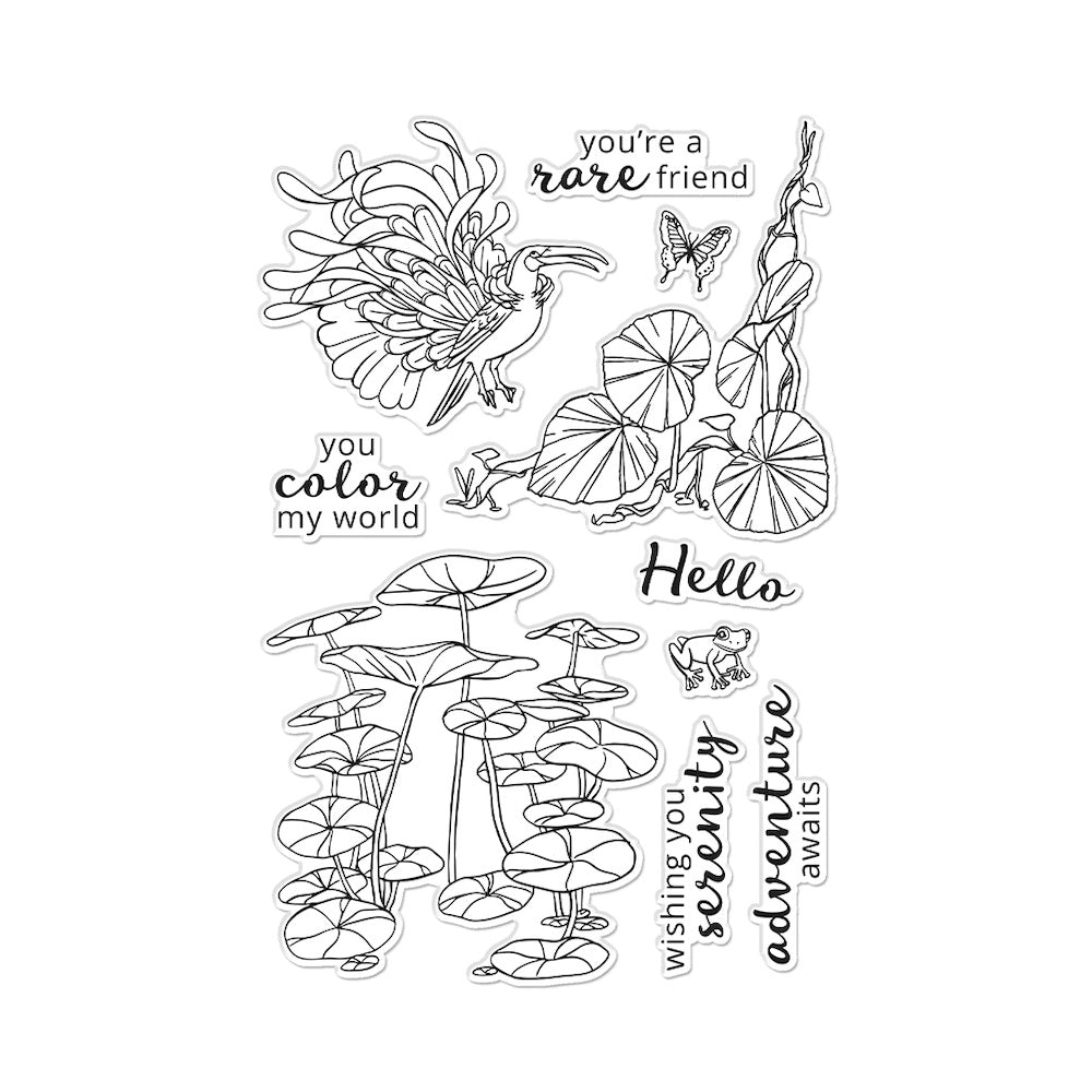 The Hero Arts Jungle Serenity Clear Stamp Set, sized at 4 x 6 inches, is crafted from genuine photopolymer, offering top-tier quality in the market. Made in the USA, these non-toxic and biodegradable stamps ensure a perfect ink transfer for a true impression every time. Simply peel the stamp from its backing and adhere it to an acrylic block for easy positioning. Mix and match the designs to create unique scenes. Cleaning is a breeze with water or stamp cleaner. Includes 5 sentiments.