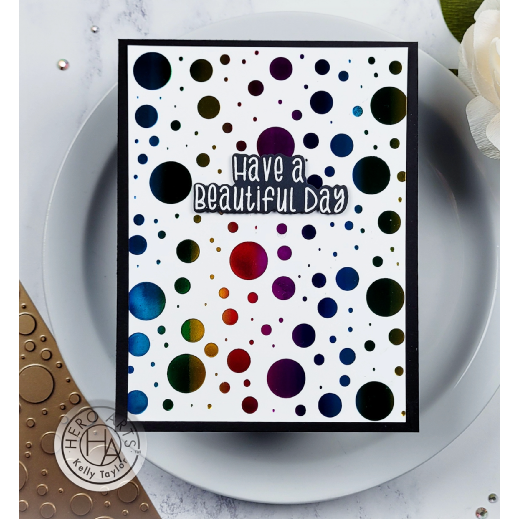 Enhance your projects with the Hero Arts Large Circle Confetti Hot Foil Plate and infuse them with a touch of captivating metallic shine. Whether you're creating cards, scrapbook pages, or exploring mixed media art, this plate offers a quick and convenient way to add a dynamic background of textured circles or dots. Let your creativity soar as you experiment with different foil colors and techniques, resulting in beautifully embellished designs that coordinate seamlessly with other Hero Arts products.