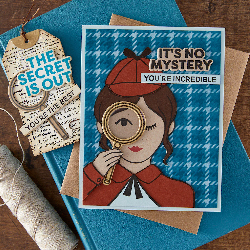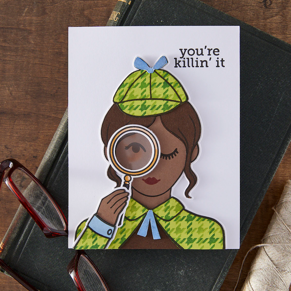 The Hero Arts Miss Detective Clear Stamp Set features a stylish lady detective, magnifying glasses, fingerprints, and three playful sentiments: 'You're killin it,' 'I see you,' and 'You did it.' This 12-piece 4 x 6 inch set from the Case Closed Collection is perfect for fun, mystery-themed cards. Pair with the Houndstooth Layering Stencils to complete her classic look. Made in the USA from high-quality photopolymer.