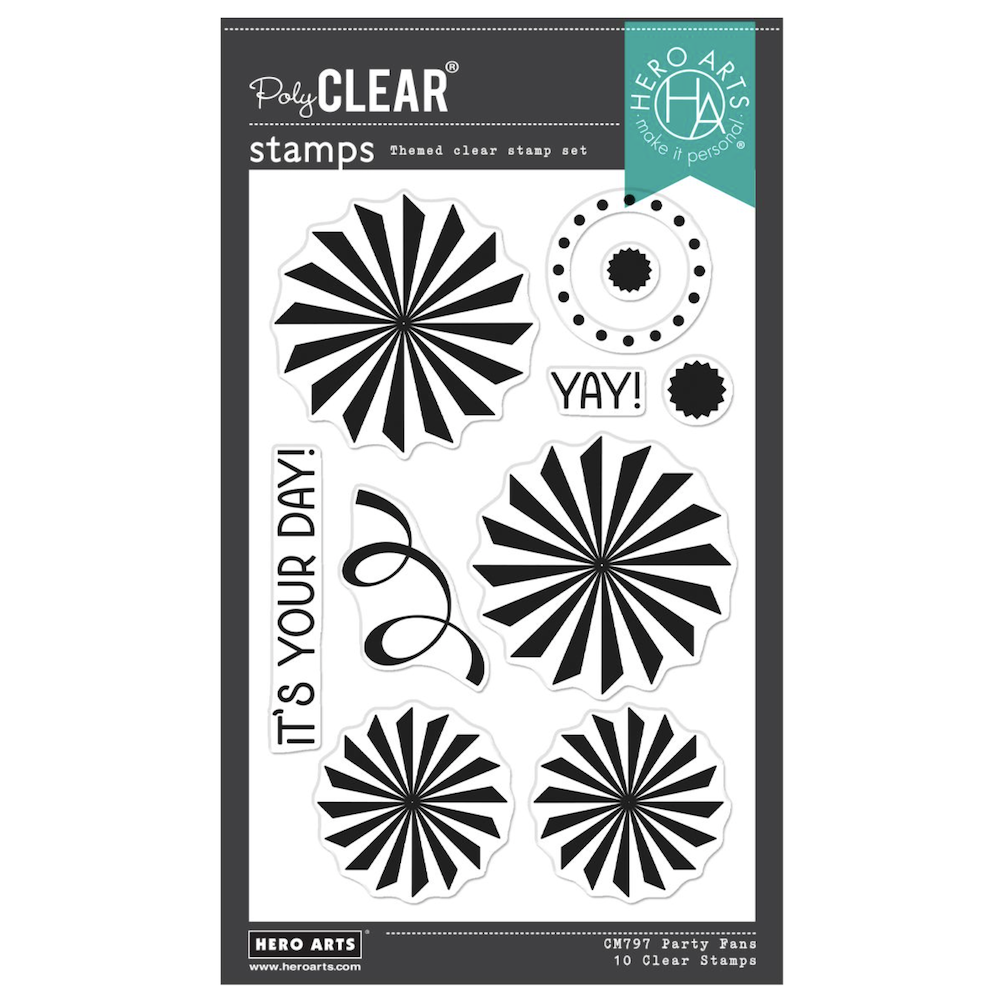 The Hero Arts Party Fans Clear Stamp Set from the Let's Celebrate Collection brings a festive touch to your projects with layered, dimensional fan designs. This 10-piece set allows you to create intricate party fans by stamping the large and small fan layers, then adding scalloped centers, confetti, dotted circles and 2 sentiments for extra texture and detail. Sentiments include,
