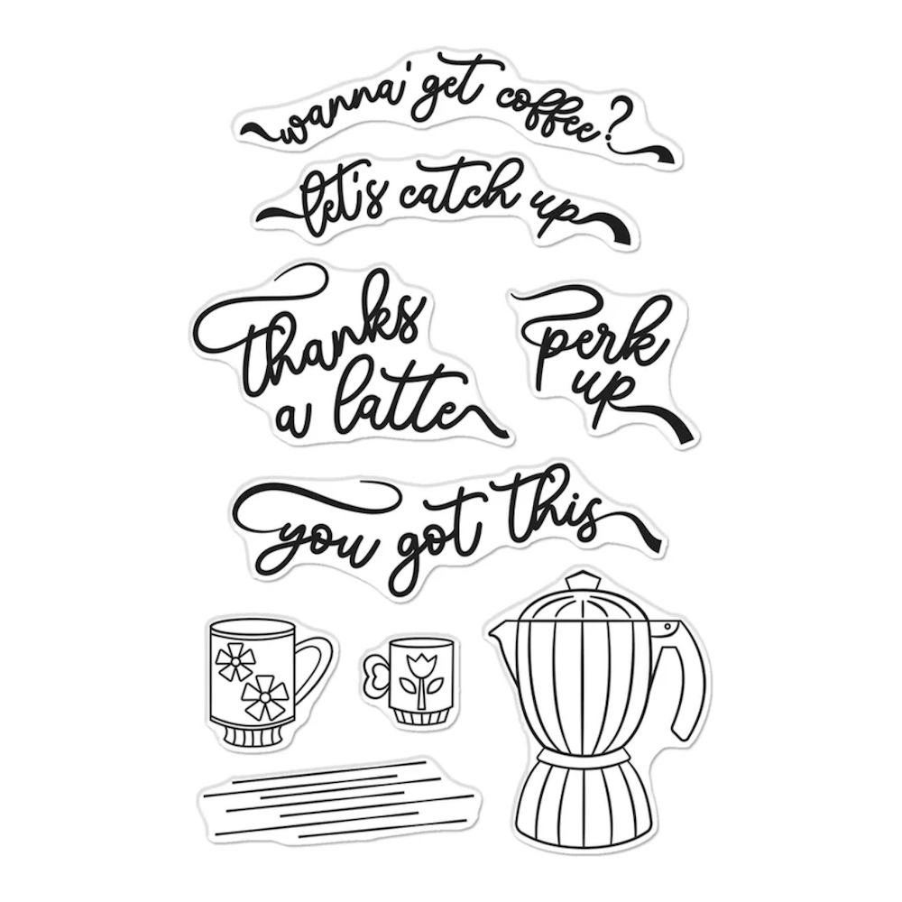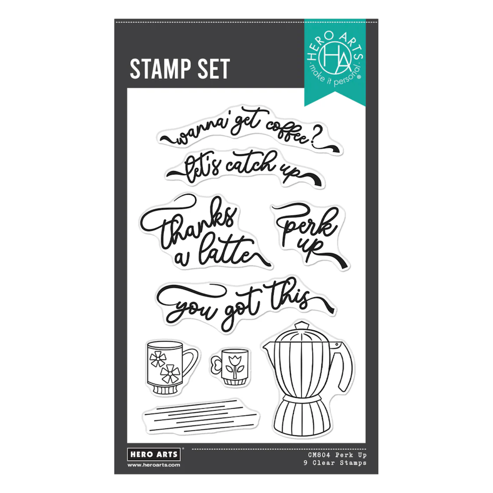 Hero Arts Perk Up Clear Stamp Set is a 4 x 6 inch photopolymer set from the What's Brewing? Collection. This charming 9-piece set includes a coffee pot, two illustrated mugs, a table element, and five bold, handwritten-style sentiments that add a cozy, conversational feel to your cards and crafts. Whether you're sending encouragement, gratitude, or an invitation to connect, these stamps bring warmth and personality to any project.