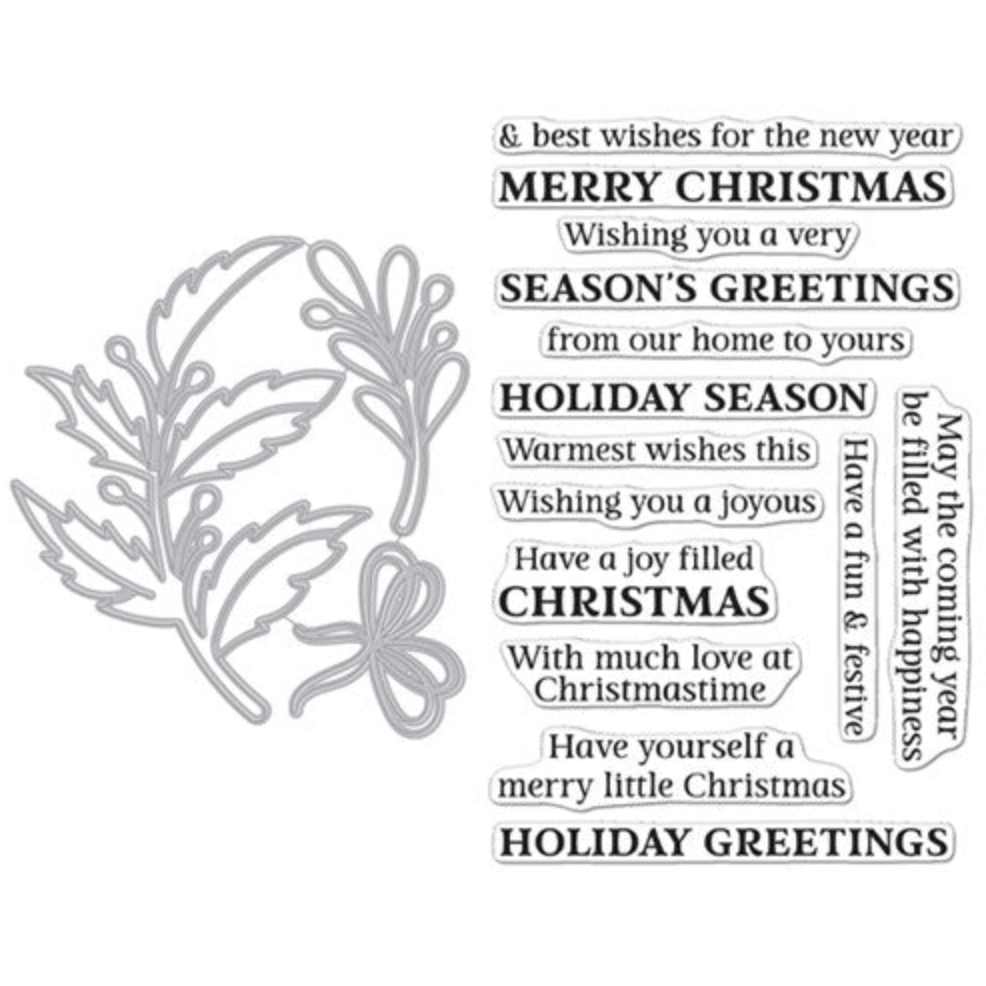 Create arrangments of holiday foliage topped off with a bow using the fancy dies in this Stamp and Cut XL set. It also comes with fourteen festive holiday sentiments that are great to mix and match for the inside and outside of your cards.