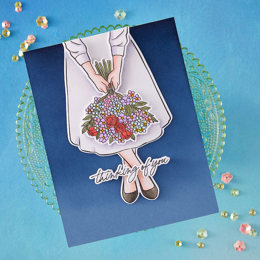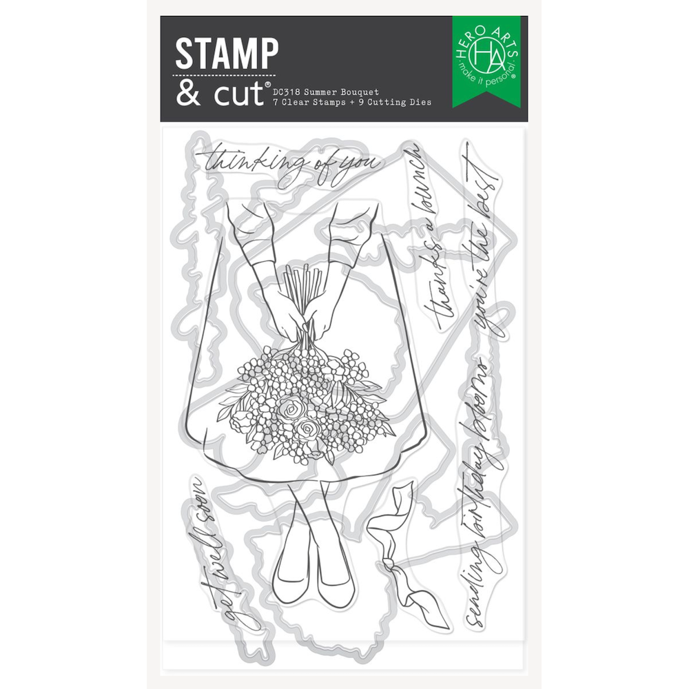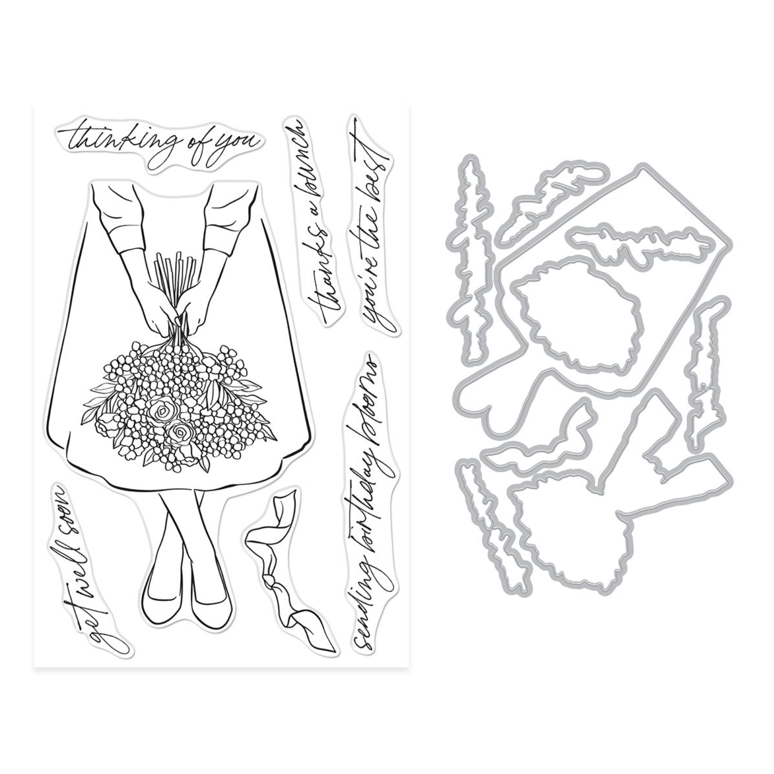 Hero Arts Summer Bouquet Clear Stamp and Die Set captures a moment of graceful simplicity, featuring the image of a woman holding a lush bouquet of flowers. This 4 x 6 inch set includes clear stamps and coordinating dies to easily cut out the figure, floral elements, and sentiments—ideal for heartfelt cards and gentle, thoughtful greetings.