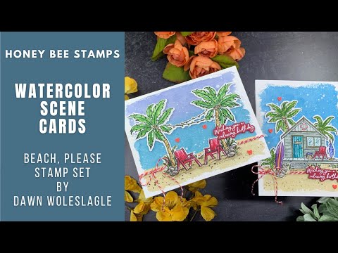 Crafted with the highest quality photopolymer, this 6x8 inch clear stamp set, designed by Dawn Woleslagle, includes 9 pieces featuring a beach house scene and a palm tree scene, complete with beach chairs and palm trees. Made with love in the USA.