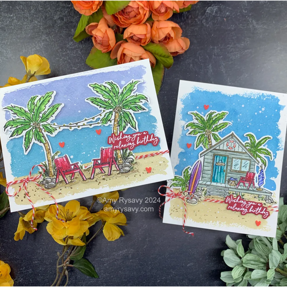 The package includes 9 steel craft dies that cut around a coordinating stamp set (hbst-605, sold separately). The dies are pre-clipped and made of high-quality finished 100 percent steel. They are compatible with most die-cutting machines on the market today. The imagery features a beach house scene and a palm tree scene with beach chairs and palm trees, shown in light gray for reference.