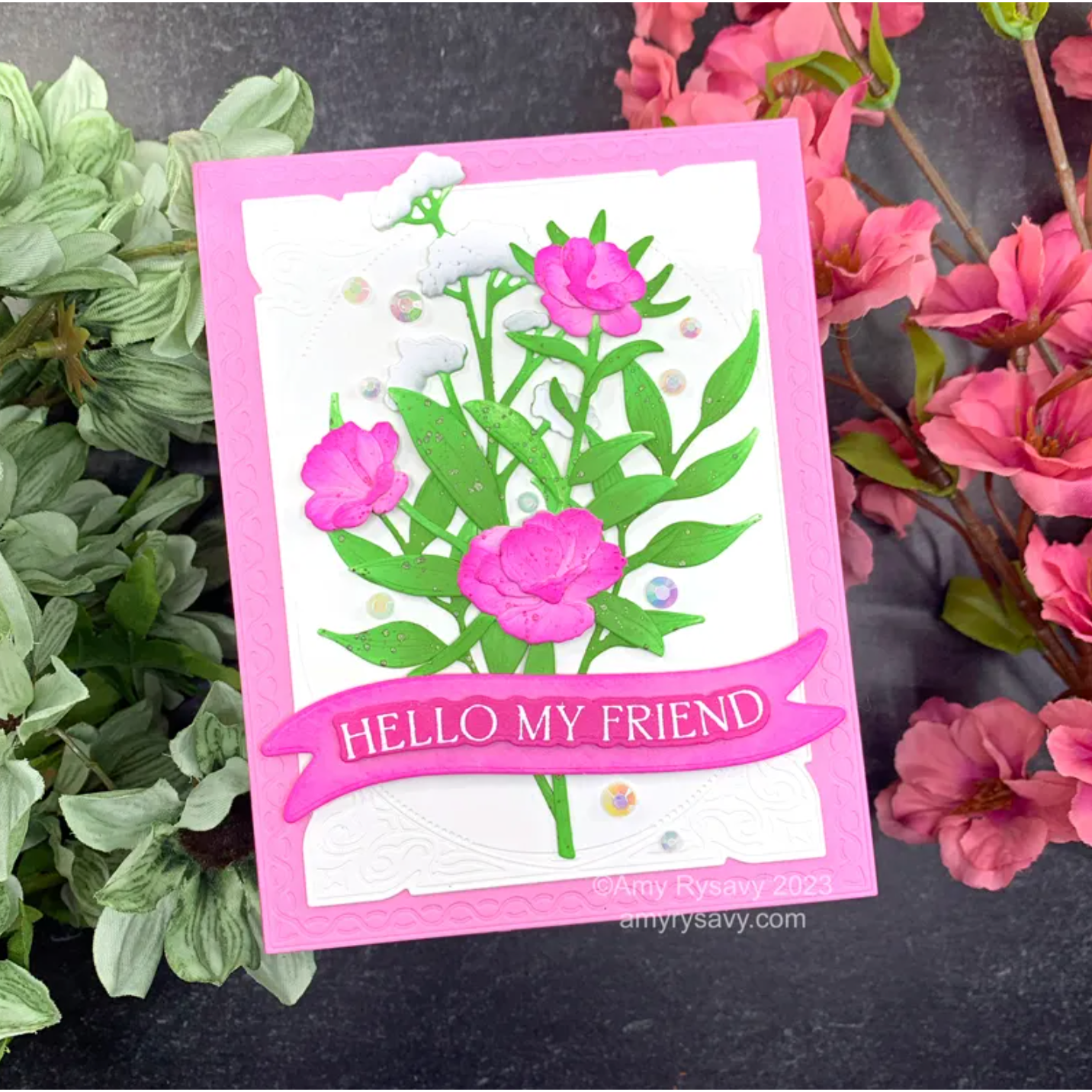 This 14 piece, 6 x 8 inch clear stamp set is designed and crafted with care in the USA using the highest quality photopolymer available and coordinates with the hbds-500 dies.