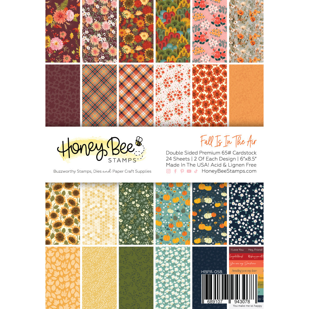 Enhance your cards and paper-craft projects with Honey Bee's 6 x 8.5 inch cardstock pads. This exclusive paper pad includes 24 double-sided sheets with 24 coordinating patterns, featuring a luxurious smooth satin finish on high-quality 65lb. cover cardstock. The imagery showcases a variety of autumn elements including flowers, leaves, trees, plaids, honeycomb, pumpkins, and more in a rainbow of colors. This pad is acid and lignin-free, ensuring archival quality, and is proudly made in the USA with love.