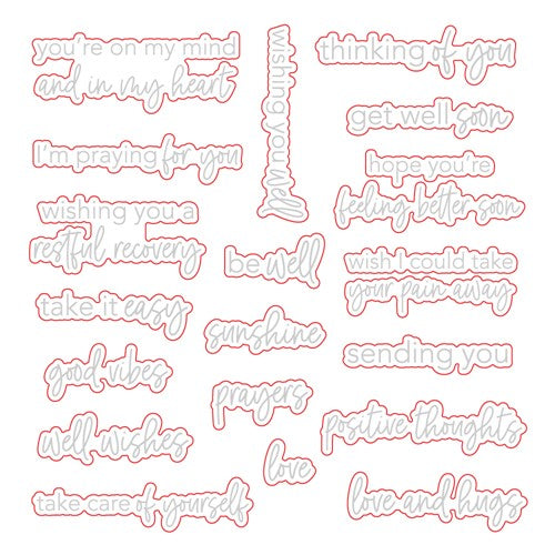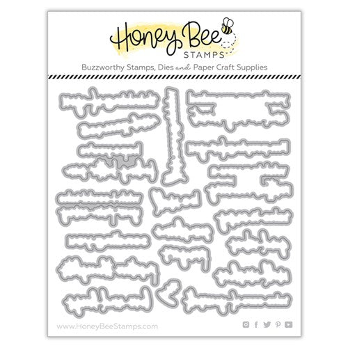 Honey Cuts Package contains 19 dies. Red lines indicate the cut lines. Light grey lines indicate metal surface area. Coordinating stamp set shown in light grey for reference only, sold separately. Dies are pre-clipped!! Honey Cuts... custom craft dies, made of high-quality finished 100 percent steel.