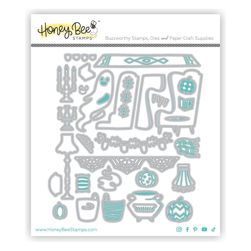 Elevate your crafting with this set of 32 layering dies. The dark gray lines indicate cutting lines while the teal details add embossed depth. These versatile dies are made of high-quality finished 100 percent steel and are compatible with most die-cutting machines on the market today. Use these pieces to decorate the Lovely Layers Fireplace (hbds-llfire, sold separately) or incorporate them into other projects. The imagery includes a variety of fall-themed elements such as a pie, ghost, spiderwebs, cauldron, armchair, book, basket with blanket and pillow, rug, candelabra, pumpkins, and lamp.