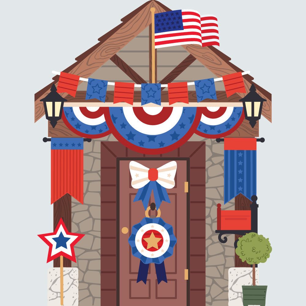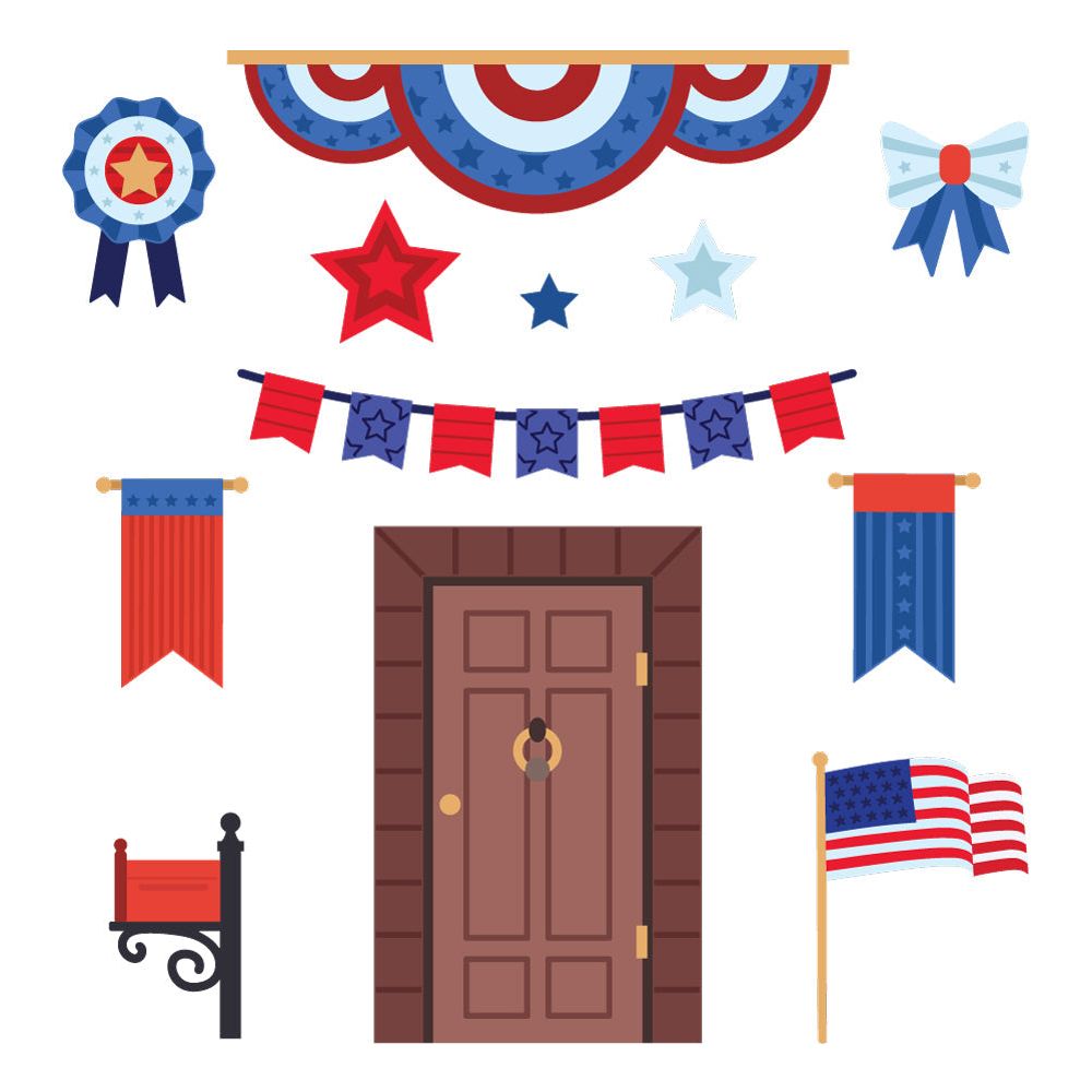 This set includes 32 steel craft dies, with dark grey lines marking the cutting lines and light blue lines indicating embossed details. Made from high-quality finished 100 percent steel, these dies are compatible with most die-cutting machines currently available. The imagery featured includes stars, a flag, banners, bunting, a mailbox, a door, a ribbon, and a bow.