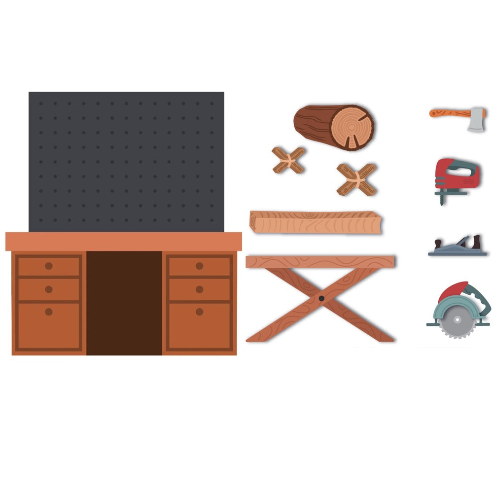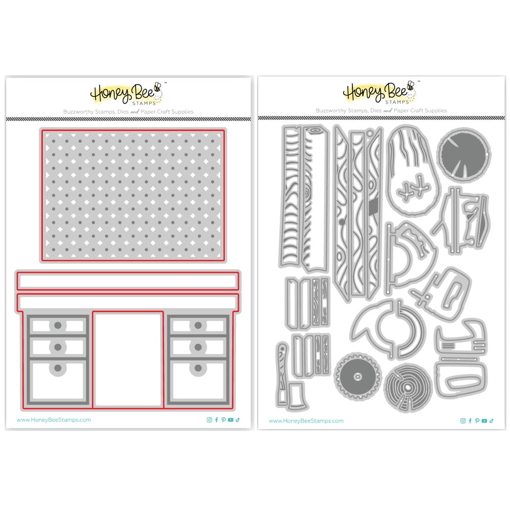 This bundle features two steel craft dies that create a charming desk and pegboard, usable together or individually. The desk design suits a teacher’s workspace, a creative maker’s station, or a practical workbench for DIY projects, fitting both masculine and feminine themes. Crafted from 100% premium steel, these pre-clipped dies are compatible with most die-cutting machines. The Honey Bee Lovely Layers Woodworking Dies set includes 15 finely detailed steel dies—such as a log, workbench, table saw, hatchet, and nail gun—delivering precise, clean cuts for sophisticated woodworking-inspired crafts.