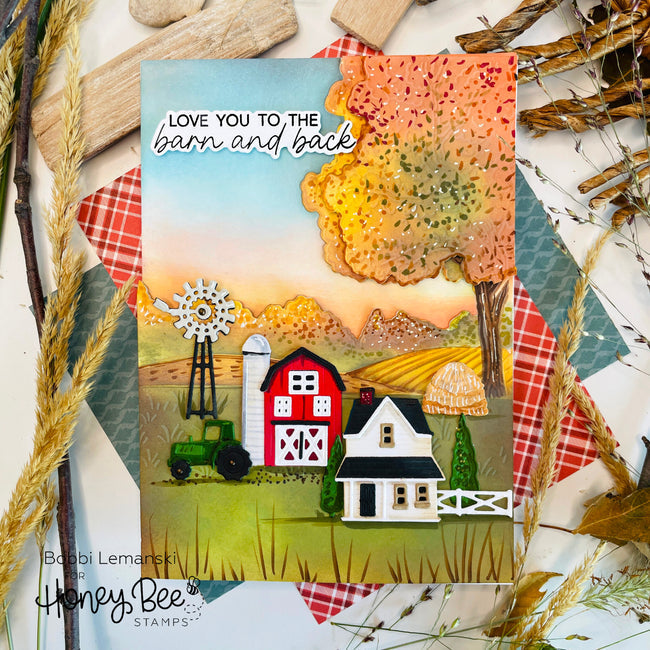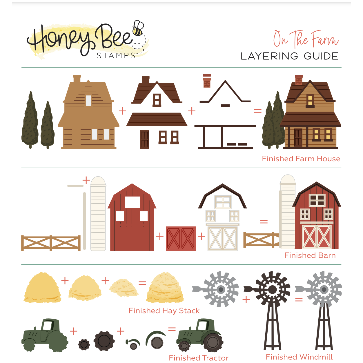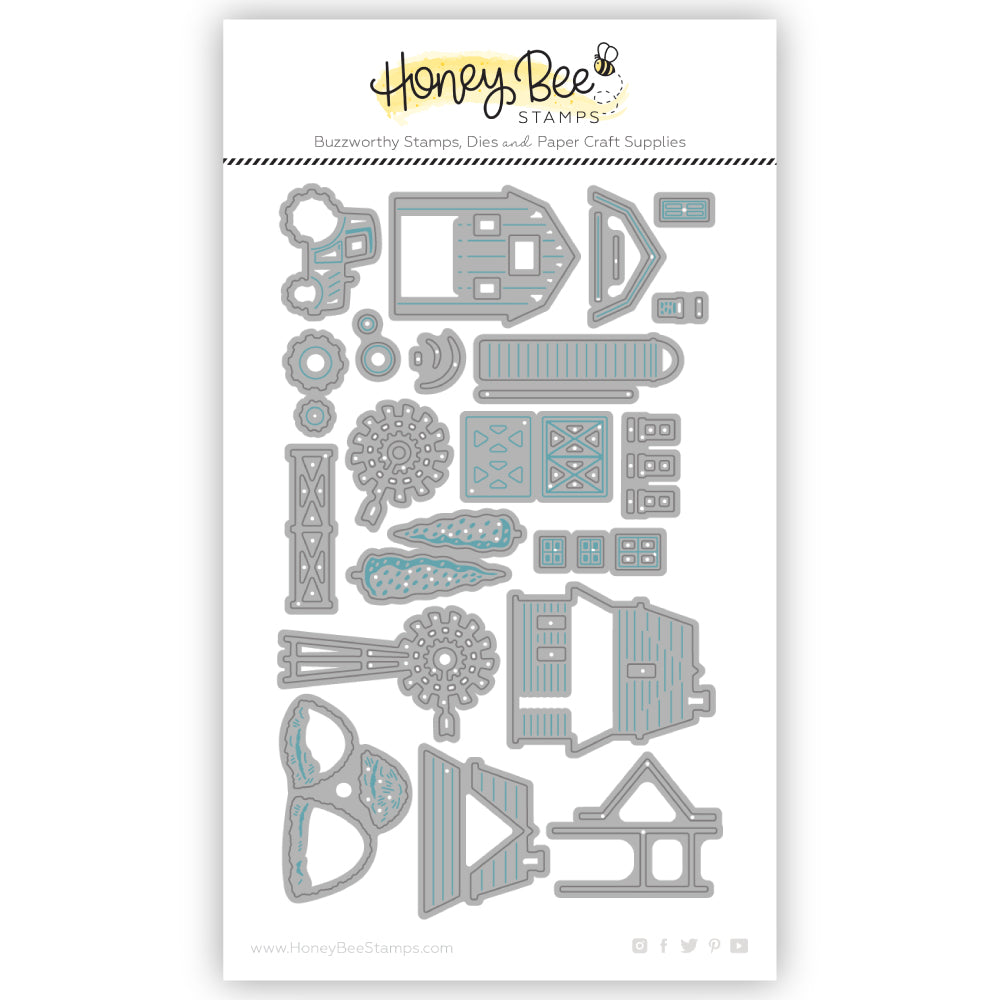 This package contains 20 steel craft dies. Clear-cut lines indicate the cutting guidelines, while blue lines indicate embossing lines. Light grey backgrounds denote individual metal dies that have been pre-clipped. Each die is made from quality, finished 100 percent steel and is compatible with most die-cutting machines. The dies within this set feature a hay stack, fence, tractor, windmill, barn and silo, home, and trees.
