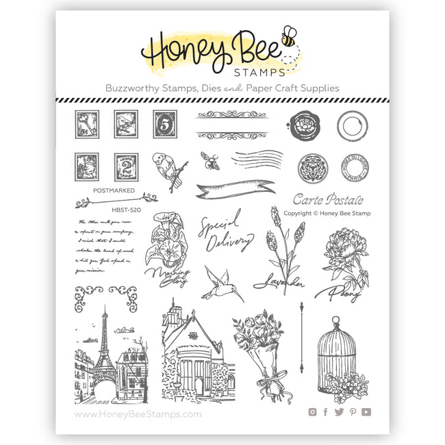 This 28-piece, 5x6 inch clear stamp set is crafted with care in the USA, using only the finest photopolymer materials. The set features a variety of imagery, such as postage stamps, birds, Parisian scenes, a birdcage, flowers, seals, and handwritten elements. Use with the coordinating die set for even more possibilities (hbds-520, sold separately).