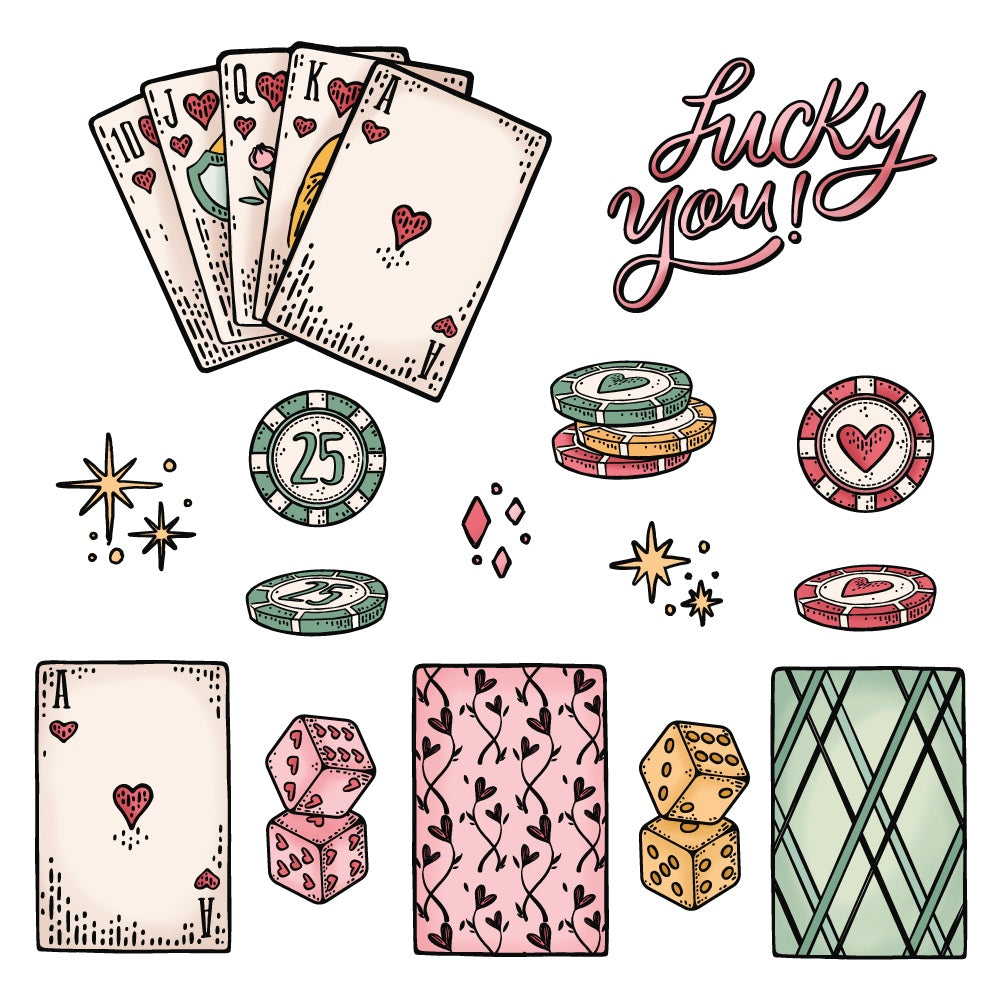 The Honey Bee Royal Flush Cling Stamps is a set of 15 rubber cling stamps that measures 6 x 8 inches. The set features various casino-themed images, including a hand of cards, poker chips, sparkles, and dice. Each stamp is designed and manufactured with care in the USA.