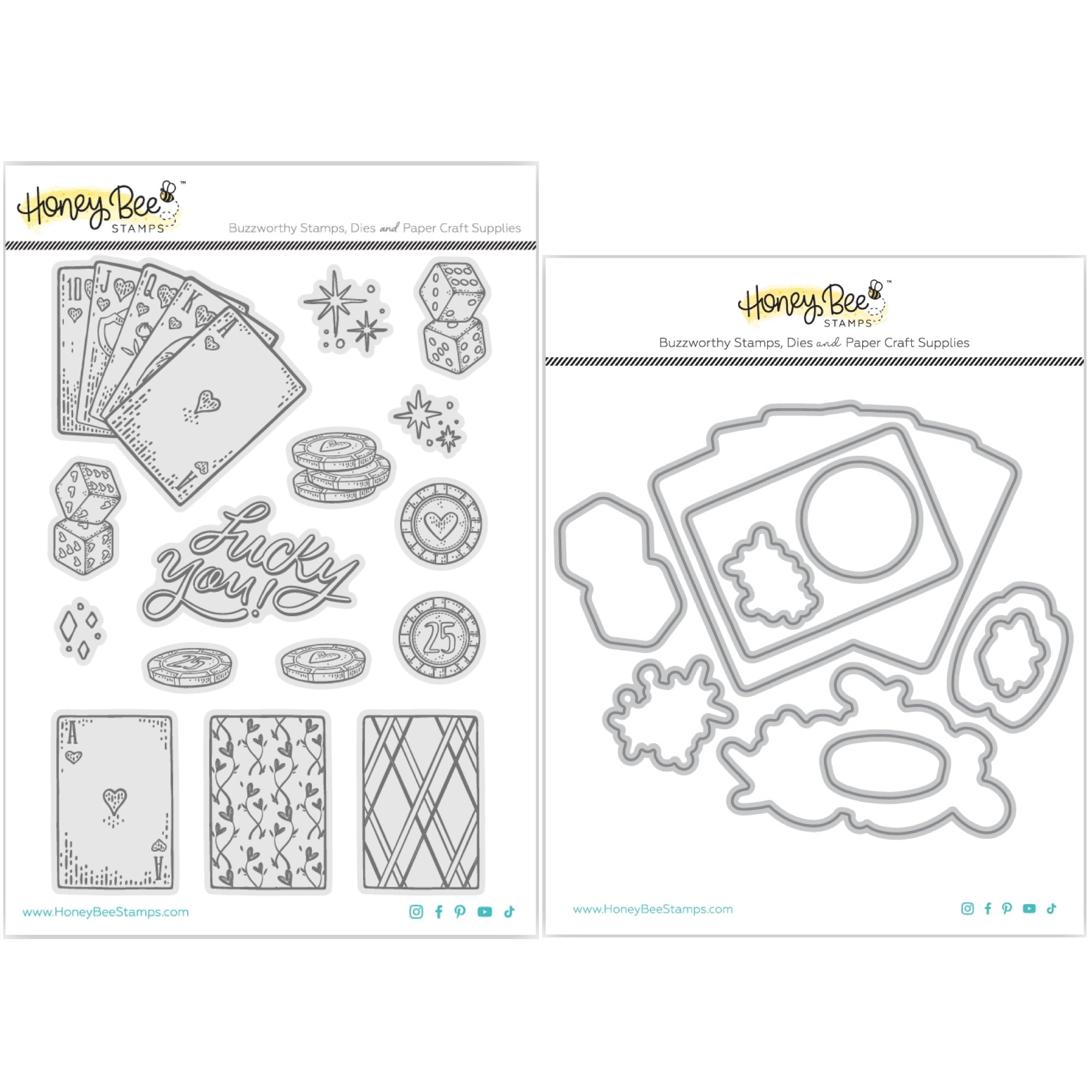 The Honey Bee Royal Flush Dies Package includes 10 professional-grade steel craft dies that are pre-clipped and made of high-quality 100% finished steel. These durable dies are compatible with most die-cutting machines and cut around the coordinating stamp set. Stamp images are shown in light gray for reference purposes only.
