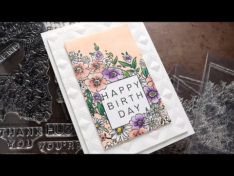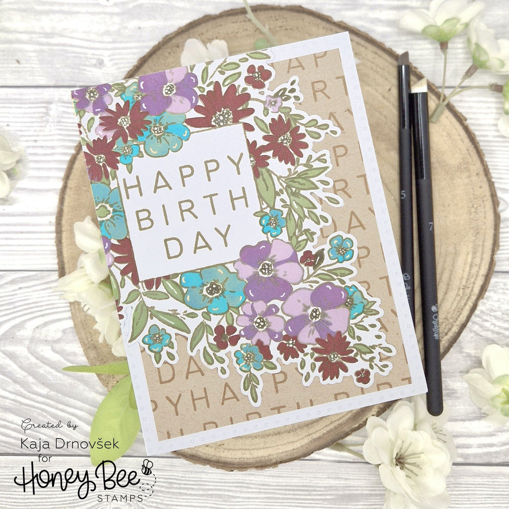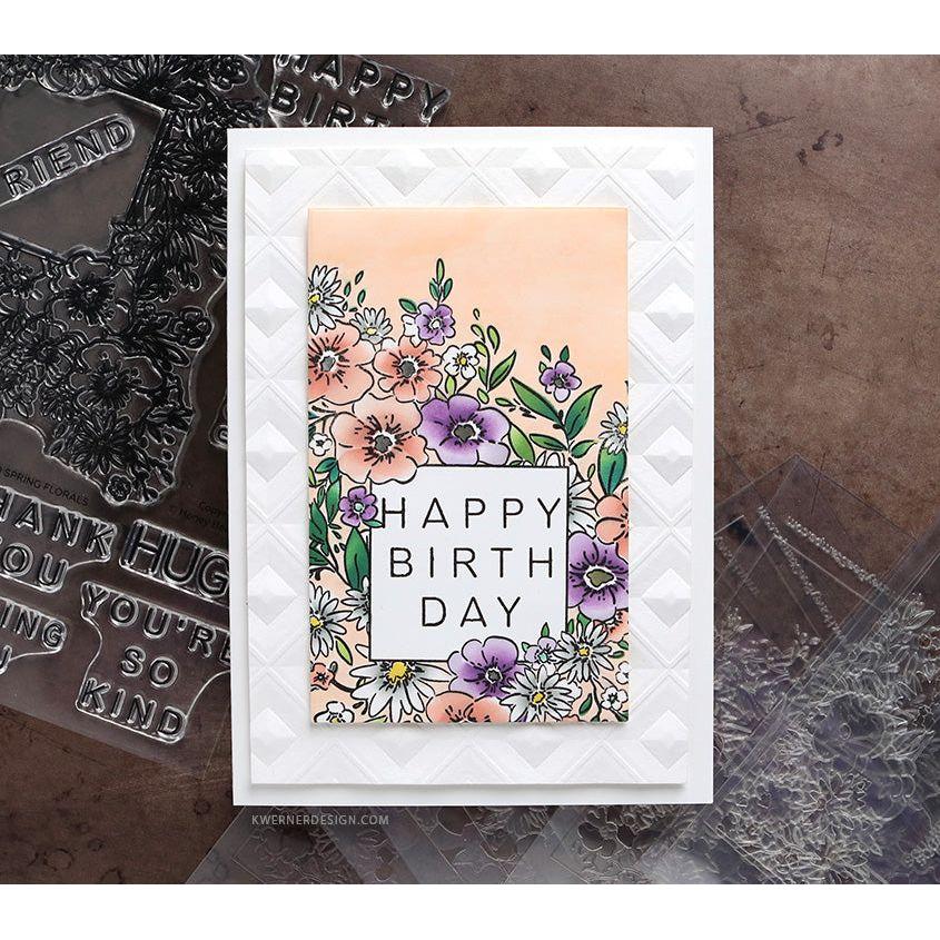 This 6x8 inch clear stamp set includes 11 pieces, featuring a square surrounded by spring florals and various sentiments. Made with love in the USA, this product is crafted from top-quality photopolymer material for enhanced durability and precision. Coordinating stencils (hbsl-145) and dies (hbds-543) are also available separately.
