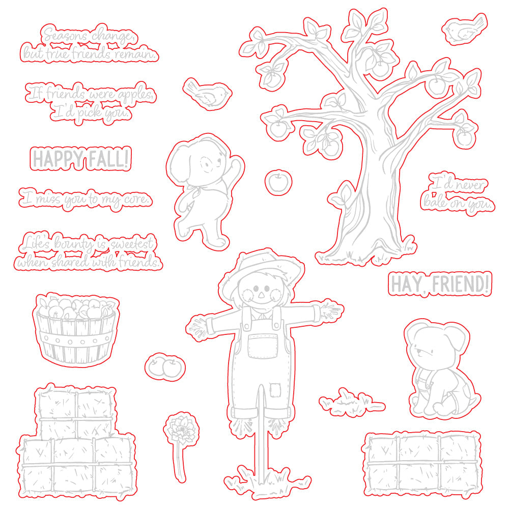 This bundle includes 20 6x8 inch clear stamps, made in the USA, and coordinating 100 percent steel dies. The stamps were created using high-quality photopolymer. The set features a variety of imagery such as a scarecrow, a puppy reaching for an apple, birds, apples, hay bales, and more, designed by Dawn Woleslagle. Craft with confidence and precision with this expertly crafted set.