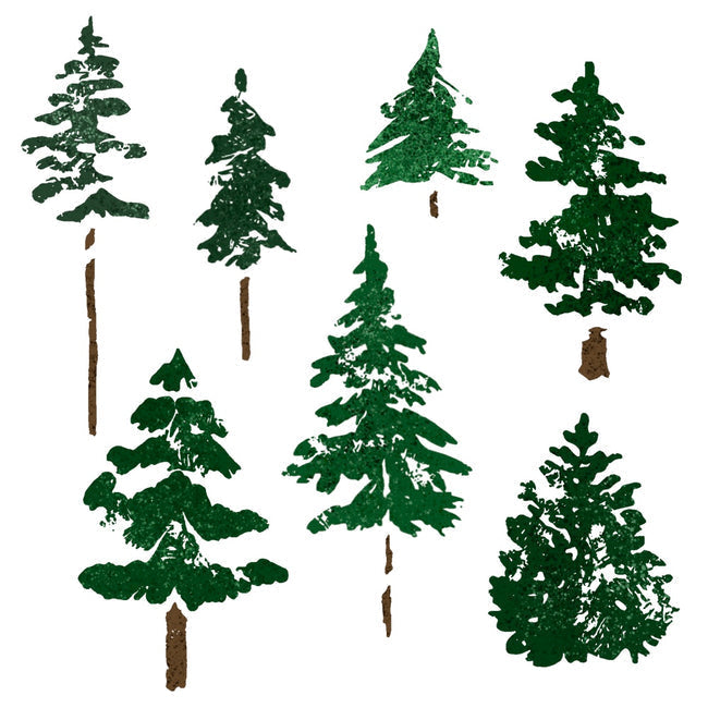 This 13-piece 5 x 6 inch clear stamp set is designed and crafted with care in the United States, making it a high-quality photopolymer. The imagery includes watercolor pines and there is a separate coordinating die set available (hbds-514).