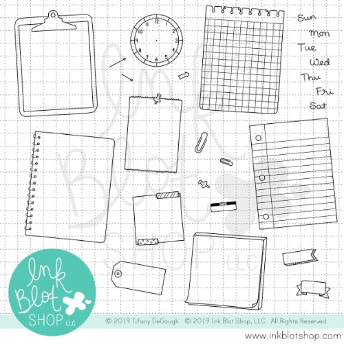 The large images in Journaling Spots can be used not only for bullet journaling, but on cards, in planners, on scrapbook pages, and in Bible journaling, too. The images or words included are: clipboard, clock, arrows for clock hands, torn grid paper, lined binder paper, spiral notebook, paper with pin, pad of sticky notes, paper with washi tapes, tag, date block, pushpin, paper clips, banners, arrow, 'Sun', 'Mon', 'Tue', 'Wed', 'Thu', 'Fri', and 'Sat'. These have been sized particularly with 5mm dot and/or grid notebooks in mind, but will work in any DIY planner or journal.