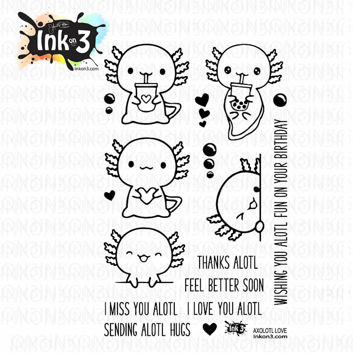 The Inkon3 Axolotl Love Clear Stamps is a 4x6-inch set featuring 17 photopolymer stamps. The axolotl, a paedomorphic salamander closely related to the tiger salamander, takes the spotlight. These charming aquatic creatures are depicted in various heartwarming scenes, from enjoying coffee or tea to holding a heart, sharing laughter, and simply having a blast. The set also includes adorable hearts, bubbles, and heartfelt sentiments like "Wishing you alotl of fun on your birthday," "Thanks alotl,” "Feel better soon," "I love you alotl," "I miss you alotl," and "Sending alotl of hugs."