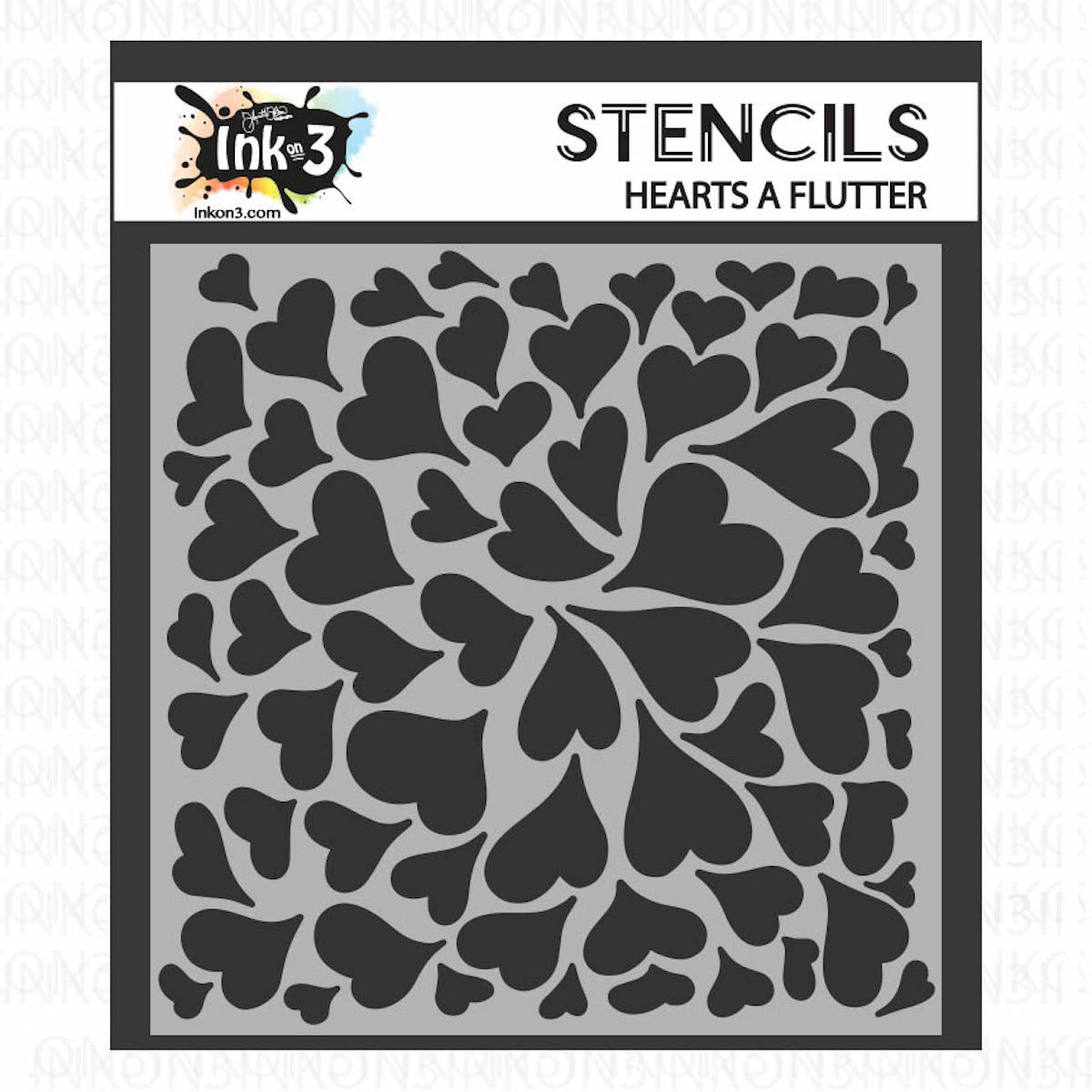 Inkon3 Hearts a Flutter 6x6 Stencil offers versatility and creativity. This stencil seamlessly pairs with a broad spectrum of mediums, including inks, acrylic paint, latex paint, spray paint, raised paints, plaster, pastes, gels, etching mediums, markers, gouache, and beyond. Its adaptability extends to 3D projects as well. Measuring approximately 6 x 6 inches, this stencil showcases a background adorned with whimsical hearts, each in varying sizes and all oriented inward.