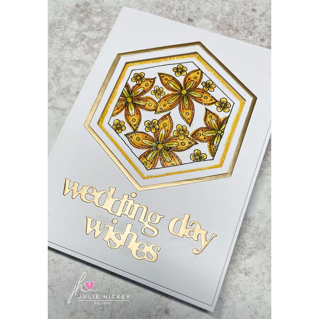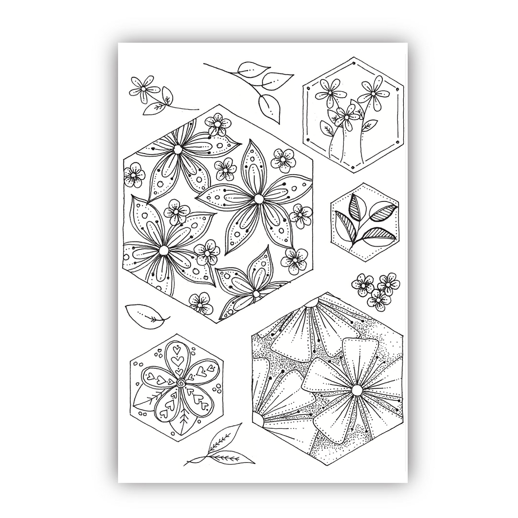 The Julie Hickey Designs Blooming Delightful Clear Stamps set features 10 individual stamps showcasing beautiful, contemporary, hand-drawn blooms in Julie's signature style. The set includes five hexagons filled with intricate floral and leaf designs, along with five smaller individual stamps: a single daisy, a cluster of daisy heads, and three unique leaf designs. This 4x6-inch clear stamp set is perfect for adding a touch of elegance and creativity to your crafting projects.