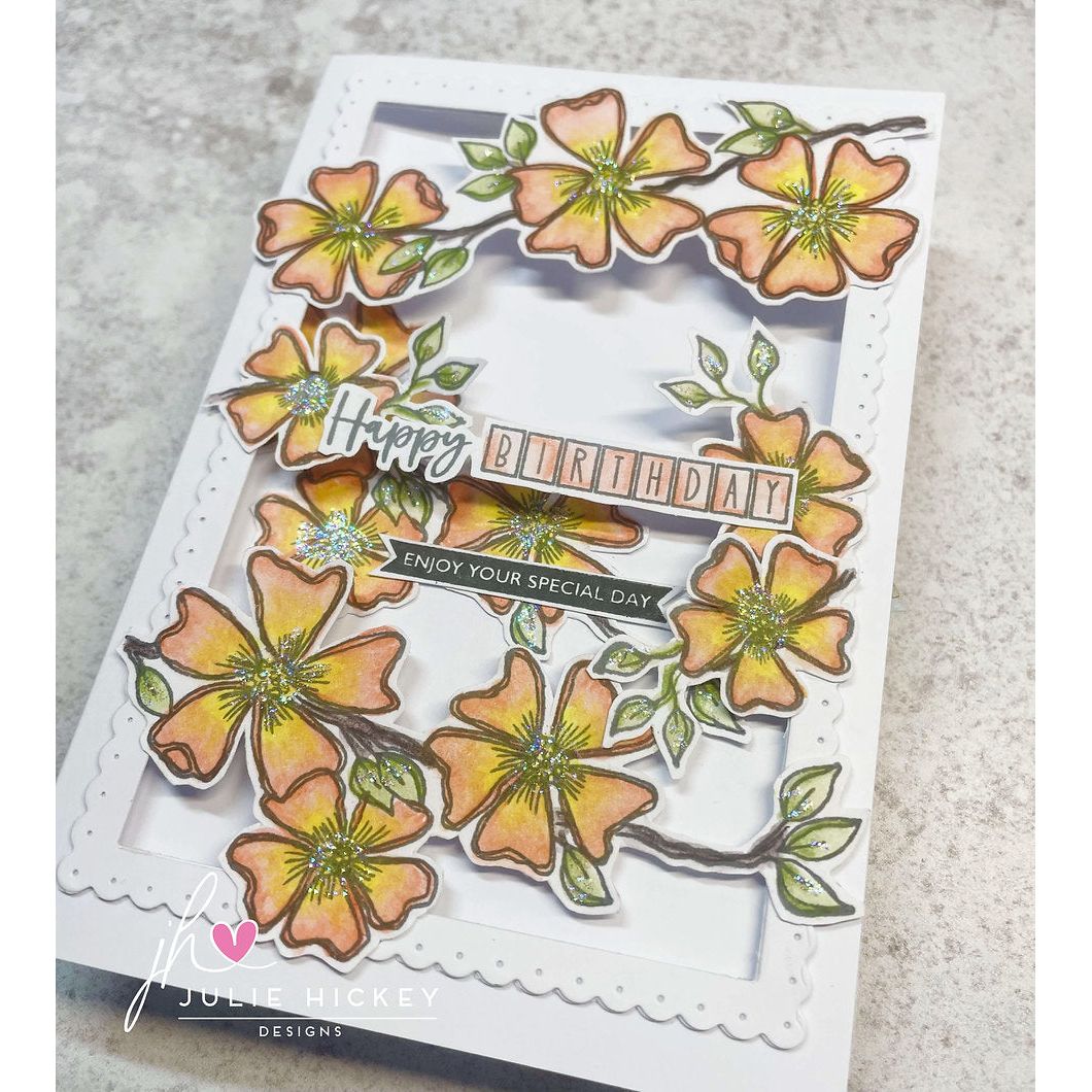 The Julie Hickey Designs Cherry Blossom Clear Stamp Set includes 8 individual stamps, featuring beautiful hand-drawn elements in Julie’s signature contemporary style.