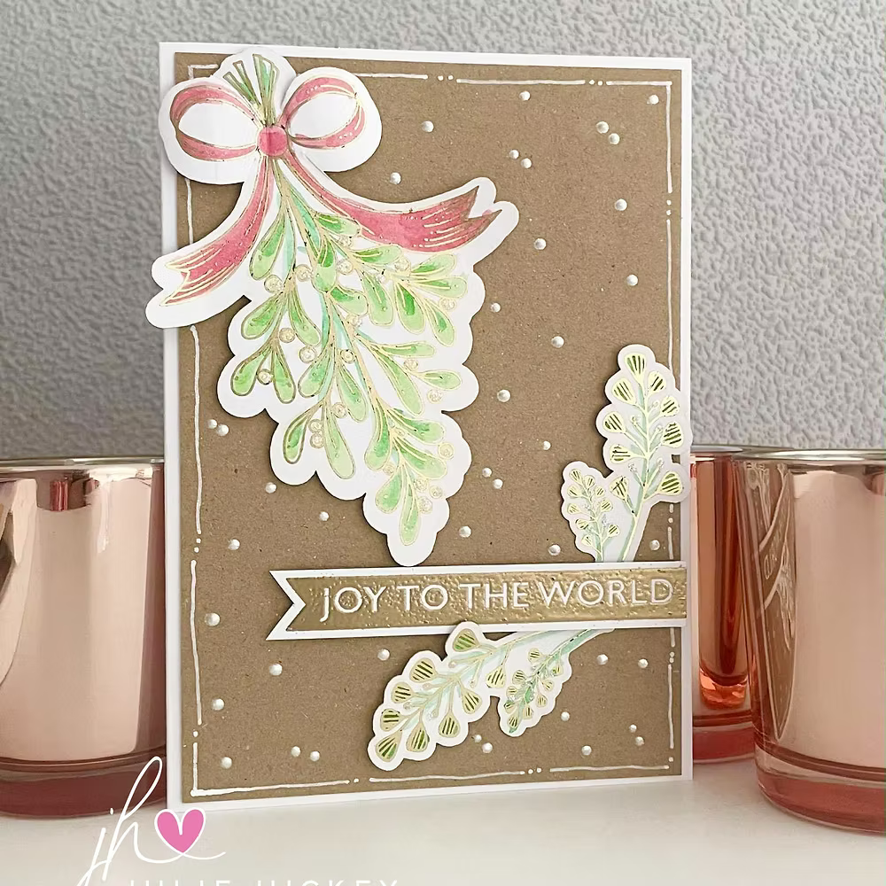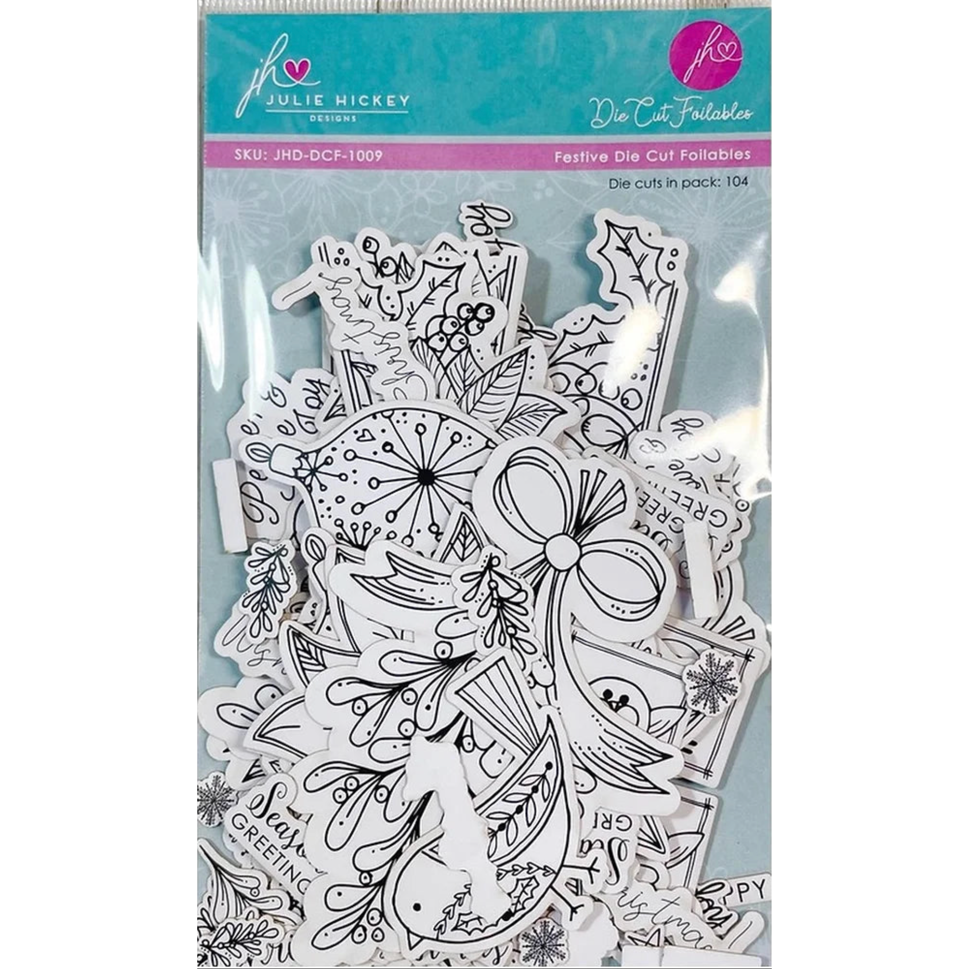 Julie Hickey Designs Festive Die Cut Foilables features 104 die-cut pieces, each showcasing Julie’s hand-drawn festive illustrations and sentiments in various sizes. The largest die cut measures approximately 4.25 x 2.25 inches.