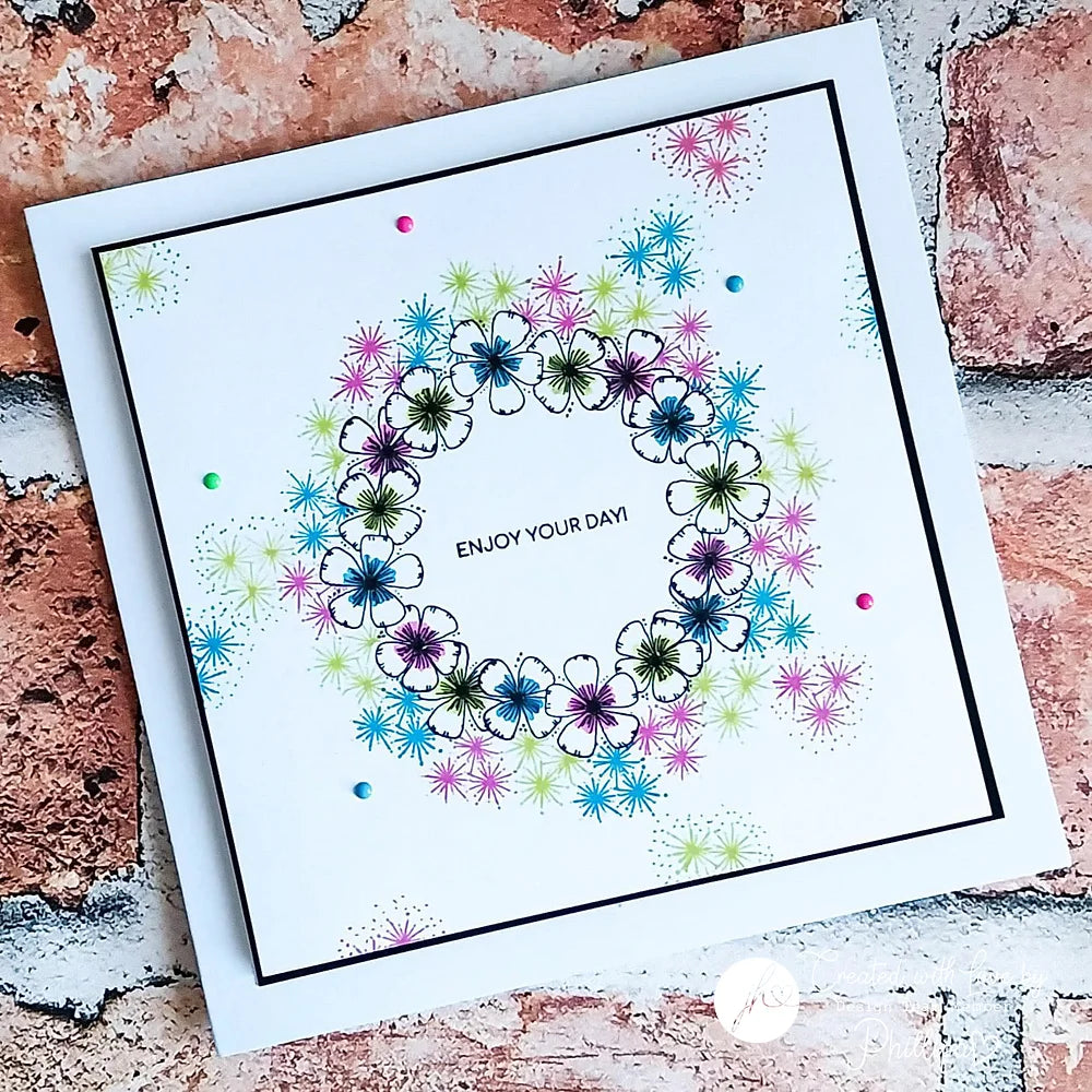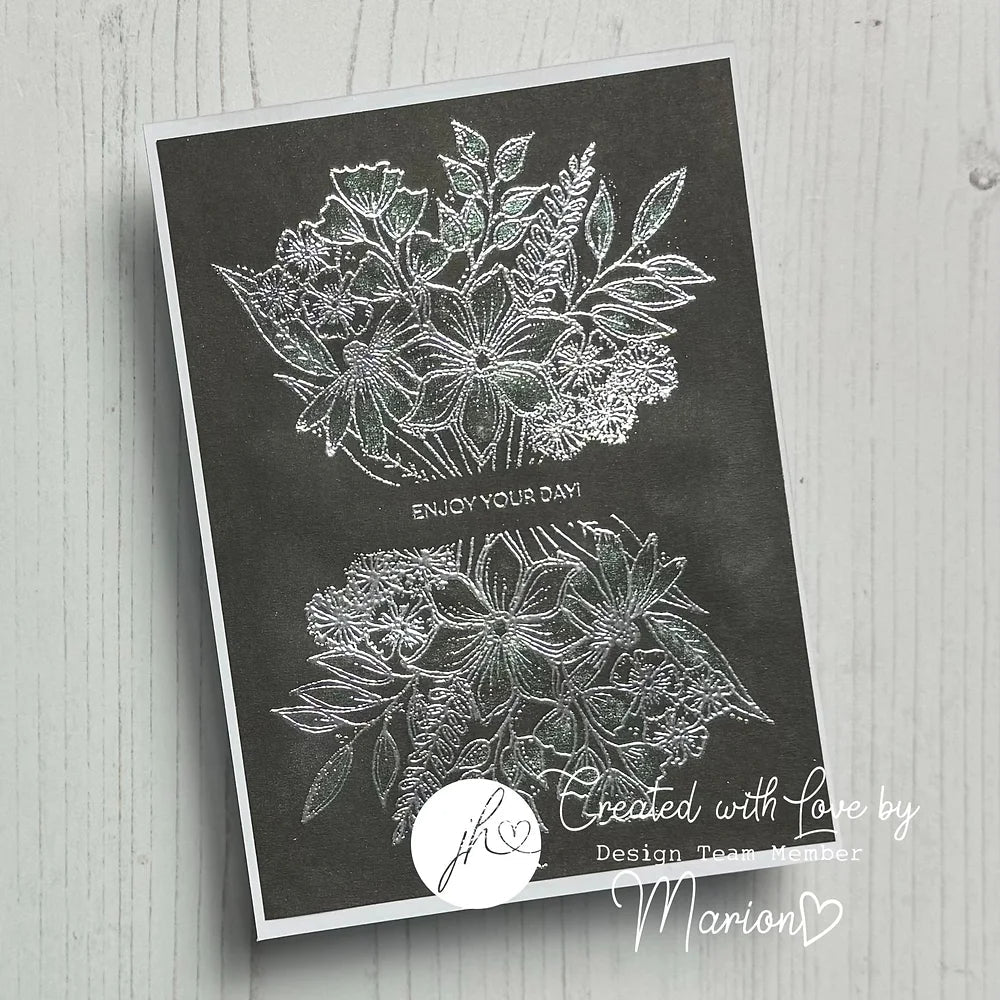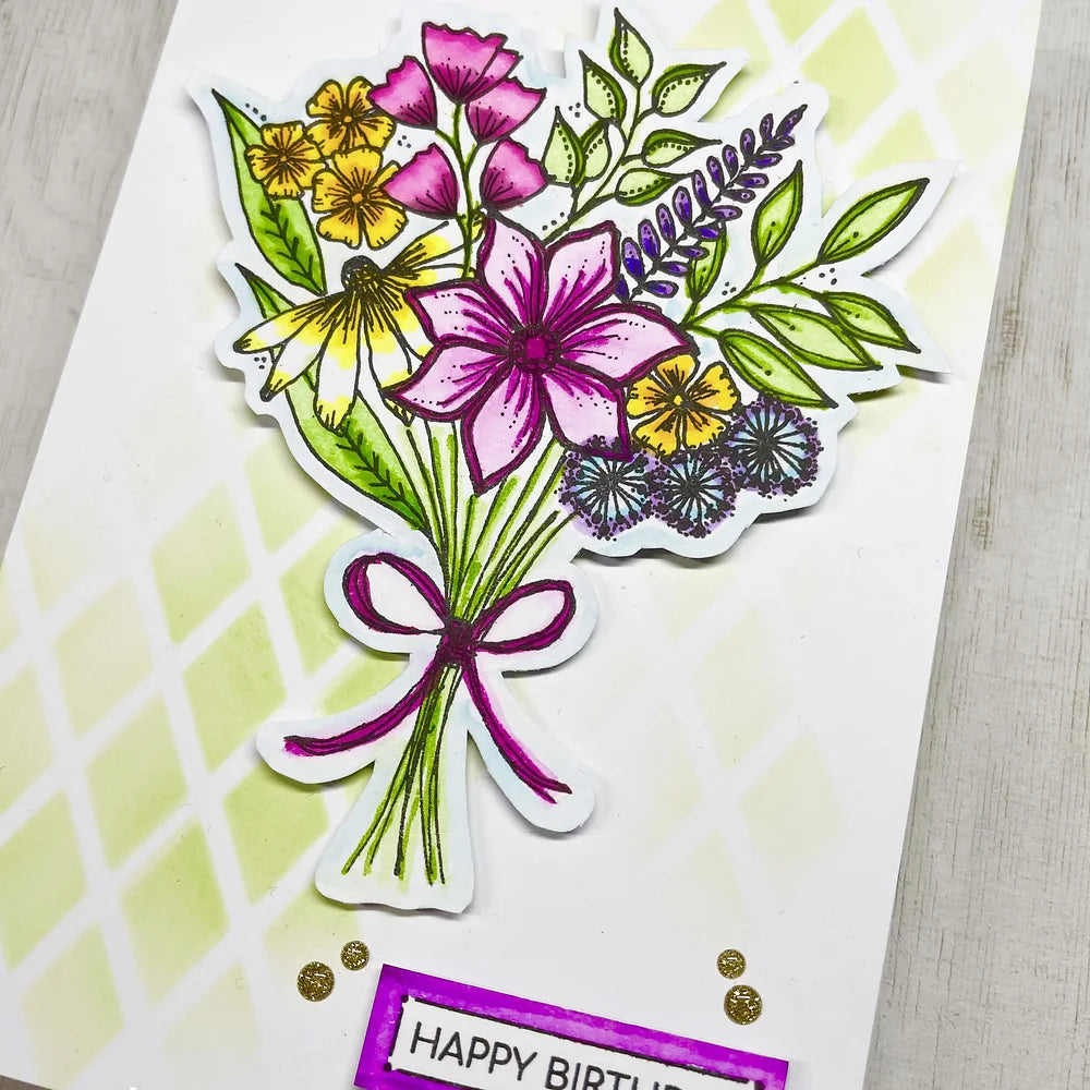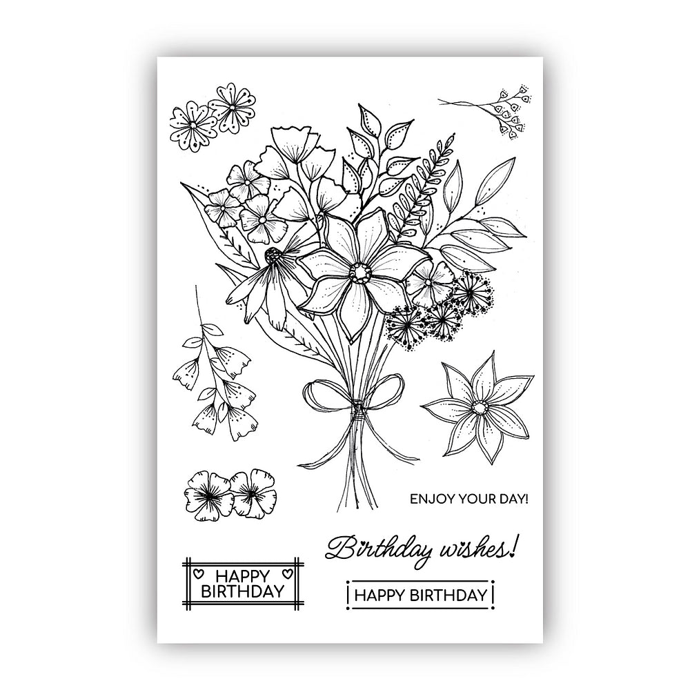The Julie Hickey Designs Julie's Hand Picked Bouquet Clear Stamps are part of Julie's Hand Picked Florals Collection. This set includes 10 individual stamps on a 4x6 inch clear stamp set featuring a beautiful large contemporary hand-drawn floral bouquet in Julie's signature style. Additionally, there are 4 sentiments featuring gorgeous hand-picked fonts, including sentiments like Happy Birthday frame with hearts, Happy Birthday with lines around, Birthday Wishes, and Enjoy your day.