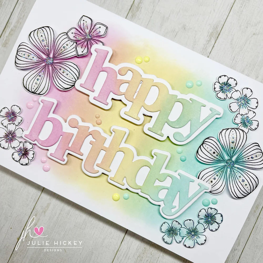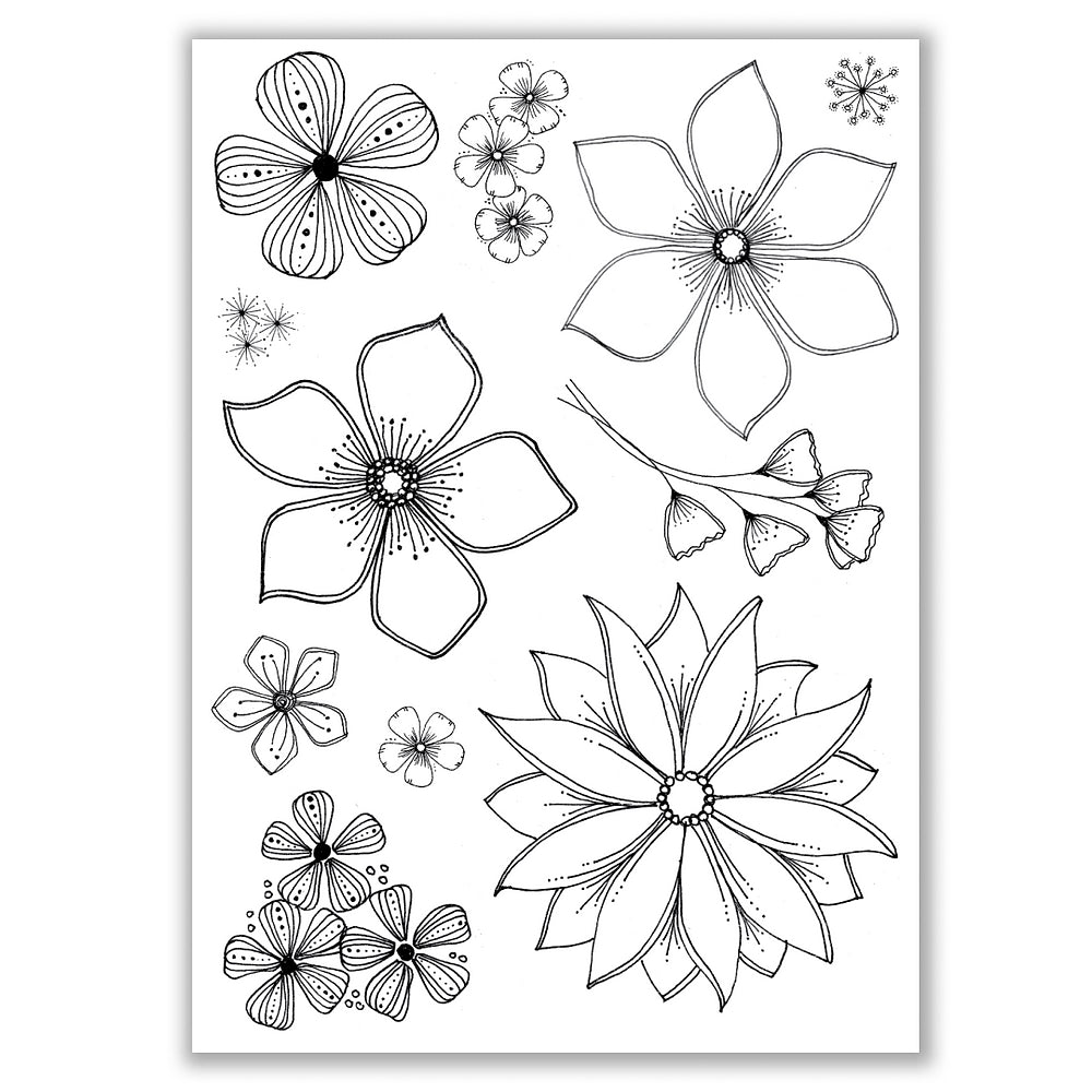The Julie Hickey Designs Julie's Hand Picked Florals Clear Stamps is part of Julie's Hand Picked Florals Collection. This collection includes 11 individual stamps on a 6x8 inch clear stamp set featuring contemporary hand-drawn florals in Julie's signature style.