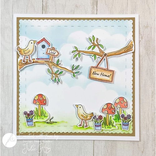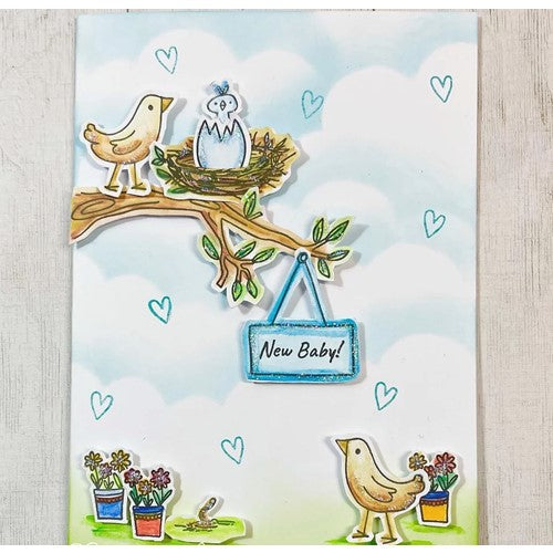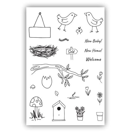 22 individual sentiment stamps featuring Mum, Dad and baby bird, babies egg, branch, nest, birdhouse, toadstool, flowers, pots, leaves, worm, sold sign, sign for sentiments: New Home, New Baby and Welcome. Perfect to create little scenes to welcome a new baby, celebrate a new home, change of address cards, and so much more!