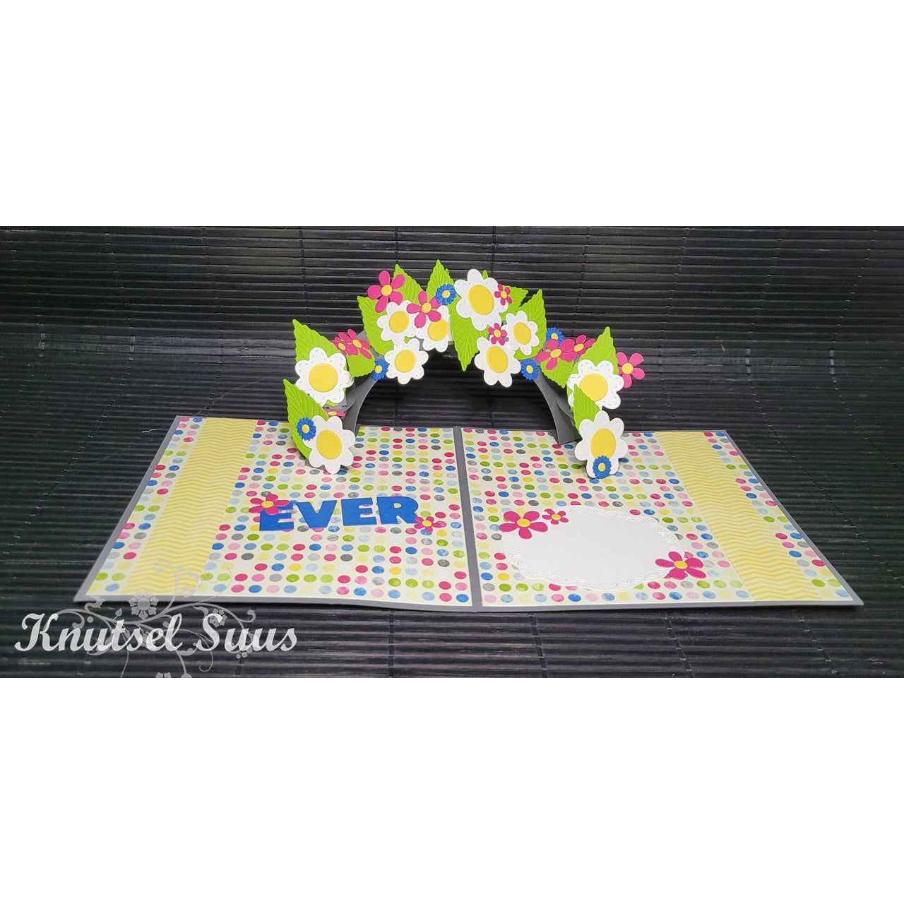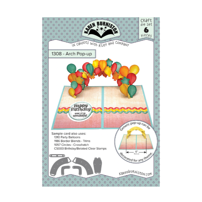 The Karen Burniston Arch Pop-Up Dies include 6 pieces that create a fun, dimensional arch for your card projects. Once assembled, the arch stands approximately 6 inches wide and pops up when the card is opened. Decorate it with balloons, confetti, or anything your creativity inspires!