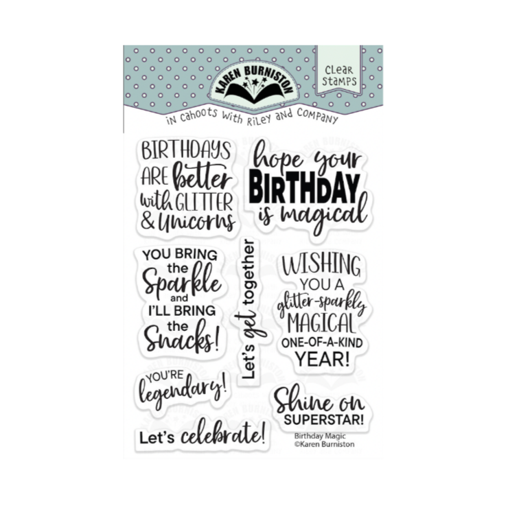 The Karen Burniston Birthday Magic Clear Stamps is a 3x4 inch set featuring 8 playful birthday-themed sentiments. Perfect for mixing and matching on cards, tags, and party projects, these stamps add a fun and festive touch to any birthday creation.