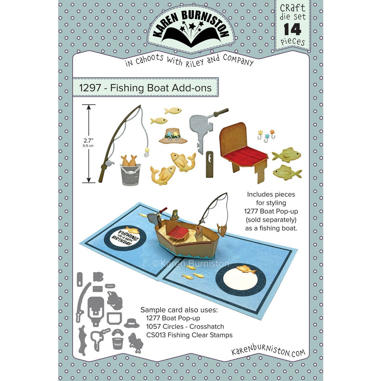 The Fishing Boat Add-Ons Dies by Karen Burniston are designed to transform the Boat Pop-Up Dies 1277 into a charming fishing boat scene. This set includes a seat, fishing pole 2.7 inches tall, fish, motor, bucket, hat, lures, and more, adding the perfect details for a fun, outdoor-inspired design.