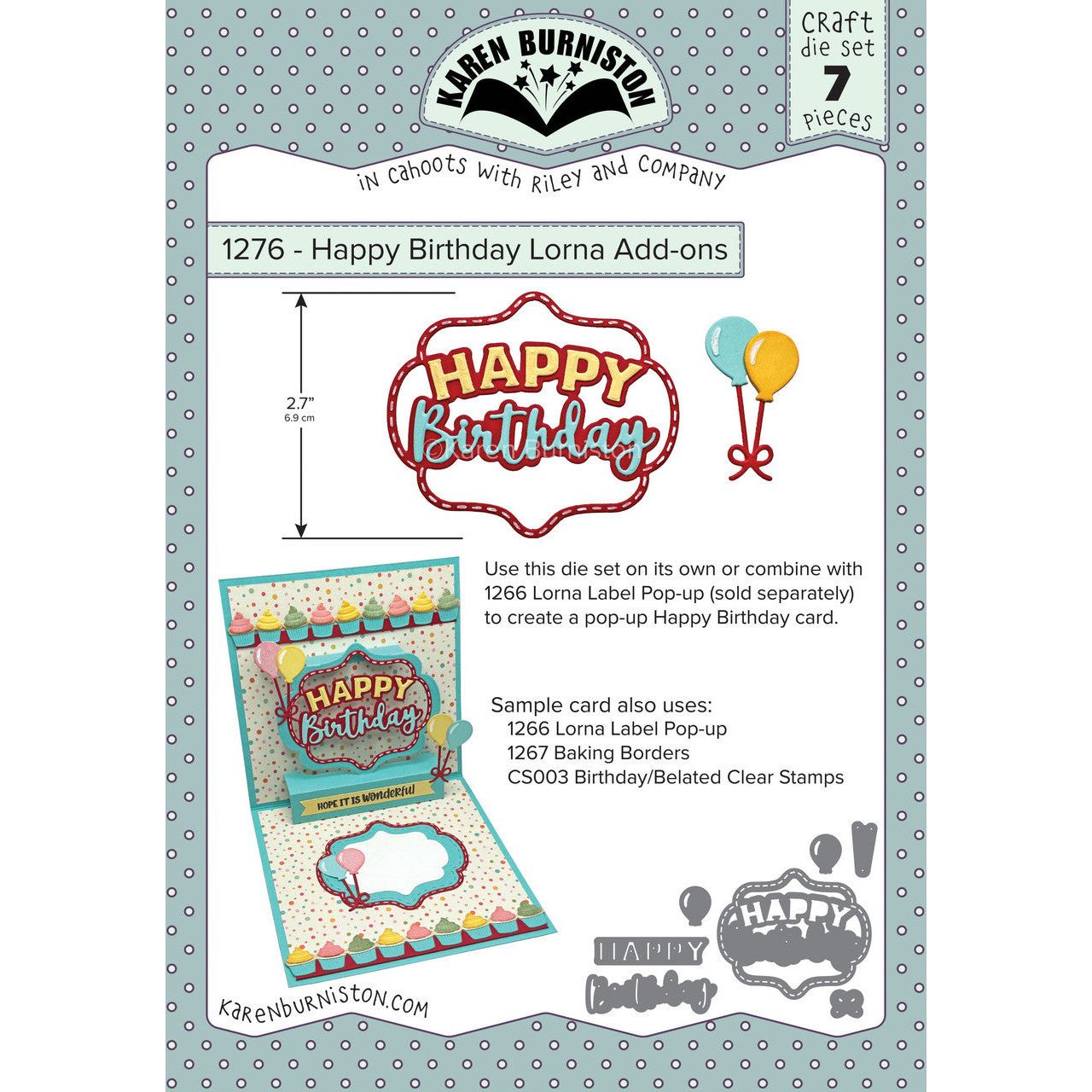 Introducing the Karen Burniston Happy Birthday Lorna Add Ons Dies! This versatile die set can be used on its own or combined with the 1266 Lorna Label Pop-up, sold separately, to create a stunning Happy Birthday pop-up card.