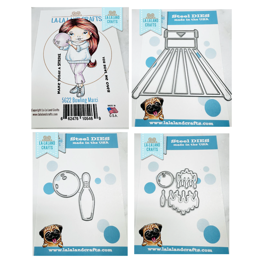 Coordinating Dies – This set includes La-La Land Crafts Bowling Lane Die 8918, La-La Land Crafts Bowling Pin with Ball Dies 8919, La-La Land Crafts Small Bowling Pins Dies 8920. High-quality steel dies designed to complement the stamp set, allowing you to cut out Marci and other bowling-themed elements with ease. These dies work with most tabletop die-cutting machines, such as Big Shot, Gemini, Crossover, and Vagabond.