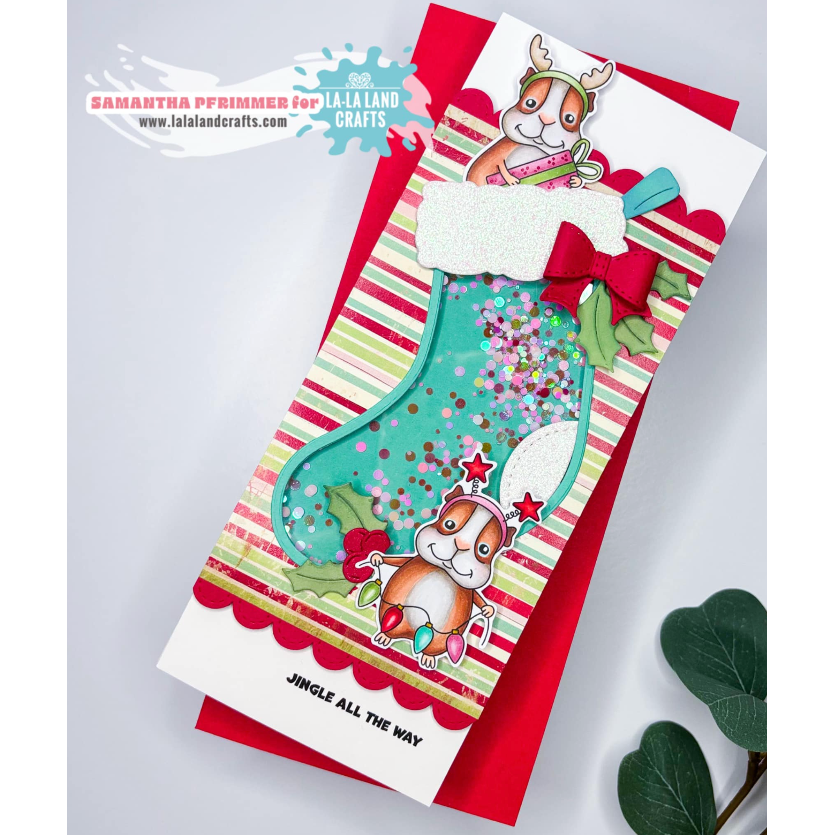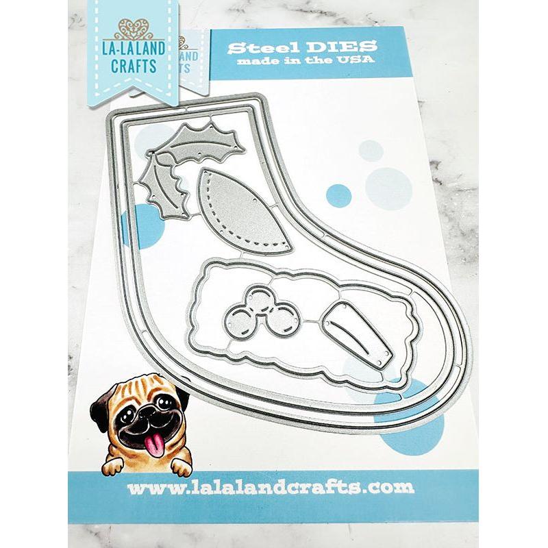 The La-La Land Crafts Christmas Stocking Dies set includes 7 dies, with two dies to create a festive stocking and additional accessory dies for decorating. The largest stocking die measures approximately 3.25 x 4 inches. These dies are compatible with most tabletop die-cutting machines, including the Big Shot, Gemini, Crossover, and Vagabond, and they can cut through a range of materials like cardstock, thin chipboard, vellum, felt, cork, acetate, and more!