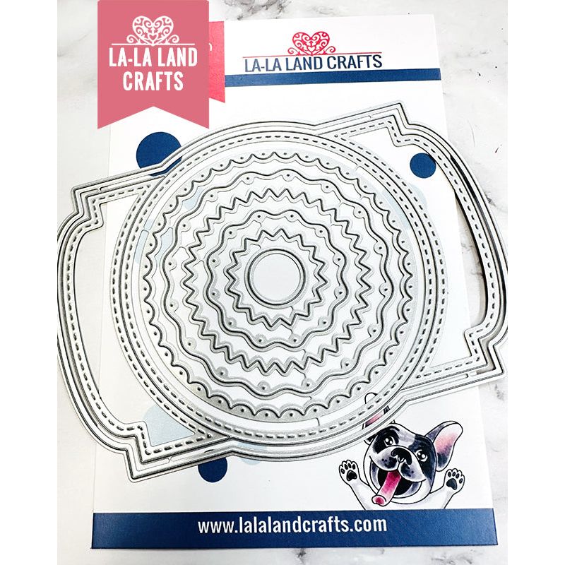 La-La Land Crafts Circle Bookplate Dies is a set of 7 detailed circular dies, each featuring a unique inner pattern and varying in size from approximately 3.25 to 0.5 inches. The largest die, designed as a bookplate, includes a beautiful stitched edge, making this set perfect for layering, framing sentiments, or adding elegant accents to your projects.