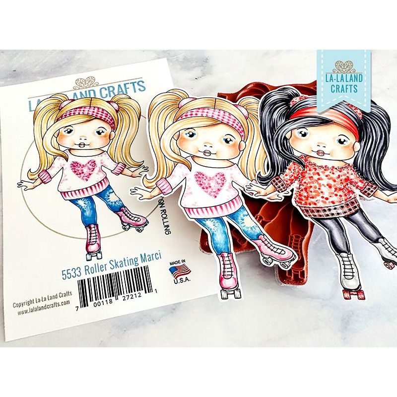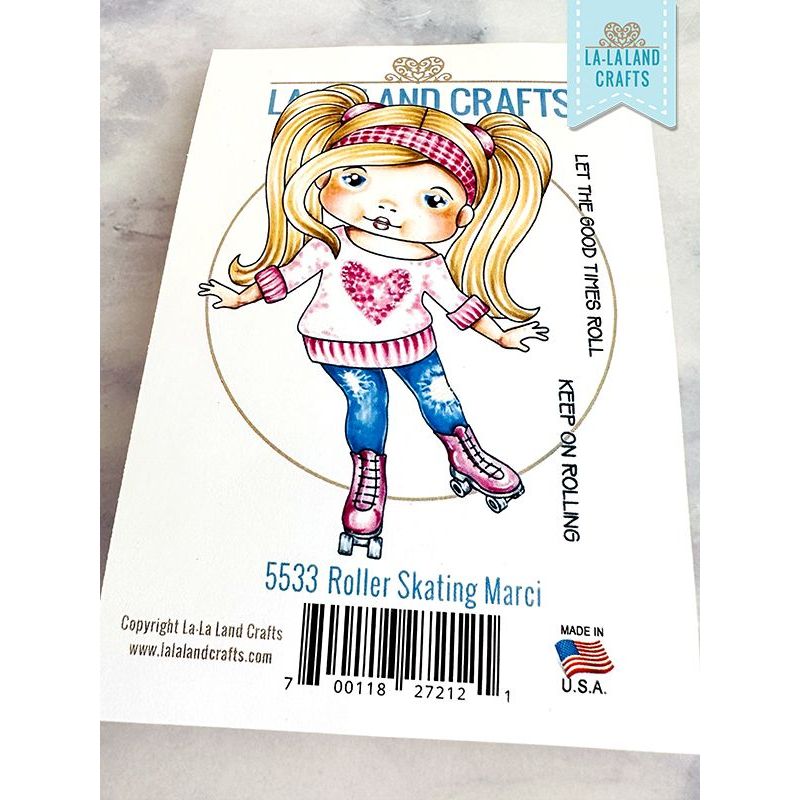 Measuring approximately 4.5 x 3.25 inches, this stamp provides a generous space to showcase its captivating images. The set includes delightful designs, featuring a girl with pigtails, a headband, a sweater, jeans, and roller skating, along with two fun sentiments. Sentiments read Let the good times roll and Keep on rolling.