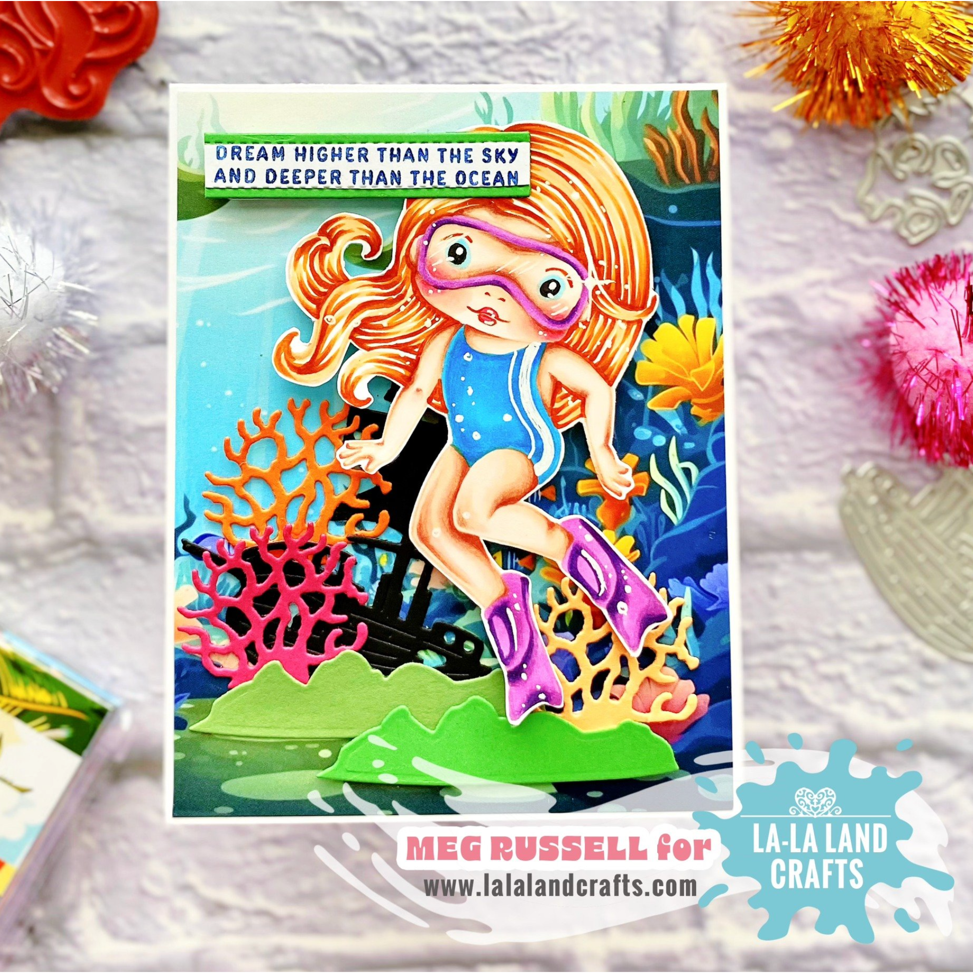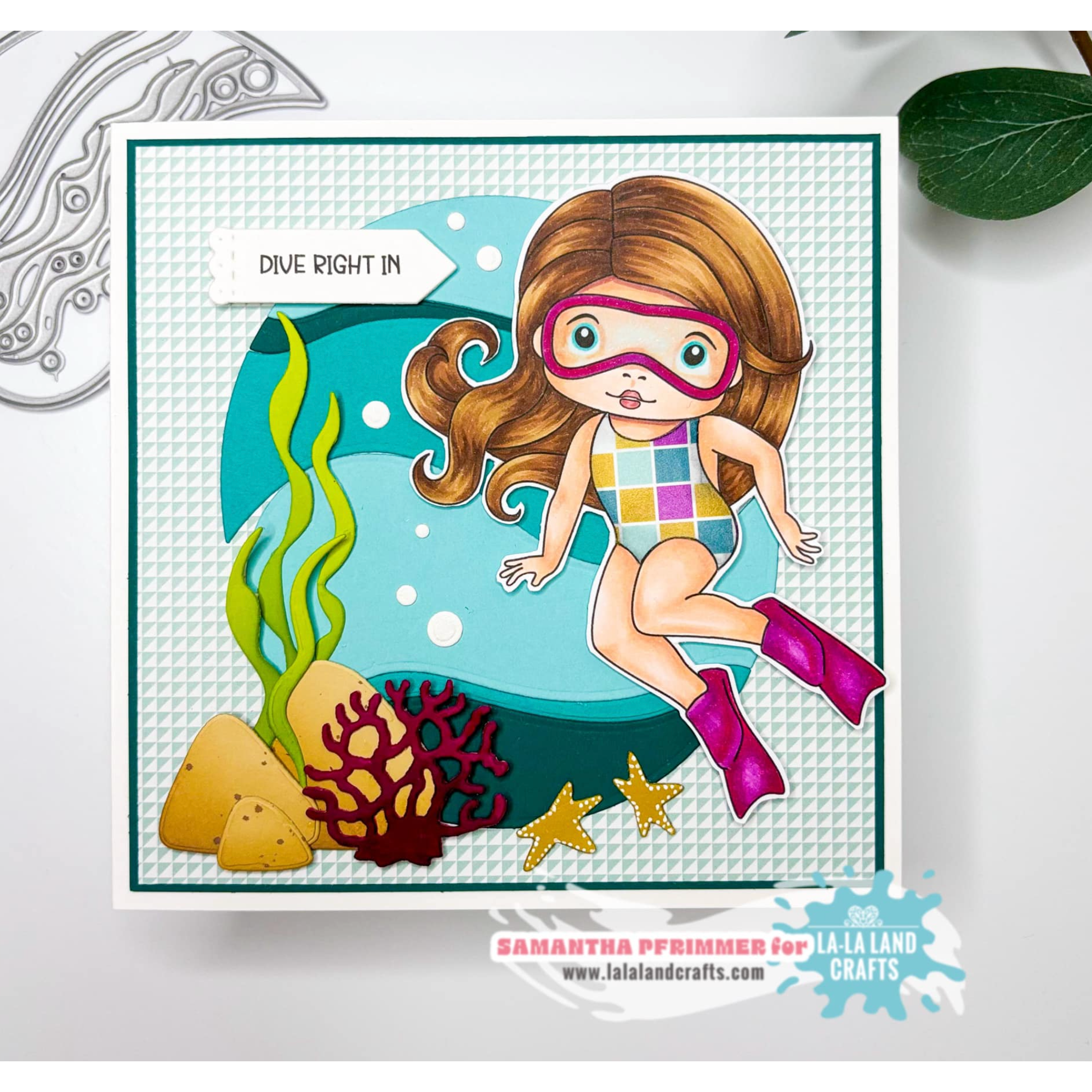Get your flippers ready! Marci is going under the sea! In this adorable set, Marci is wearing her bathing suit, flippers, and goggles as she swims along. There are also two fun sentiments included. Made in the USA from deep-etched red rubber and mounted on a cling cushion, this stamp is ready to be used with an acrylic block or stamping platform.