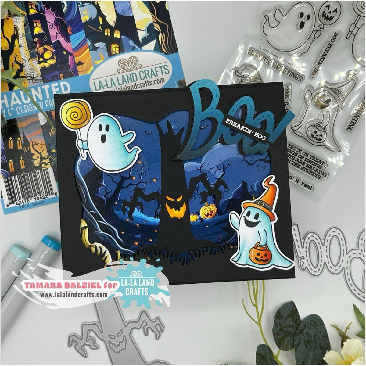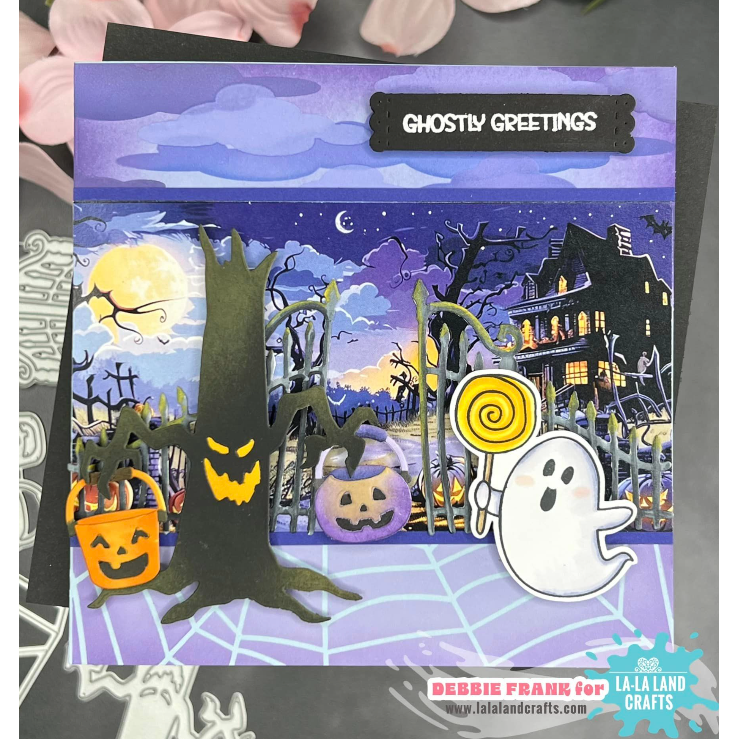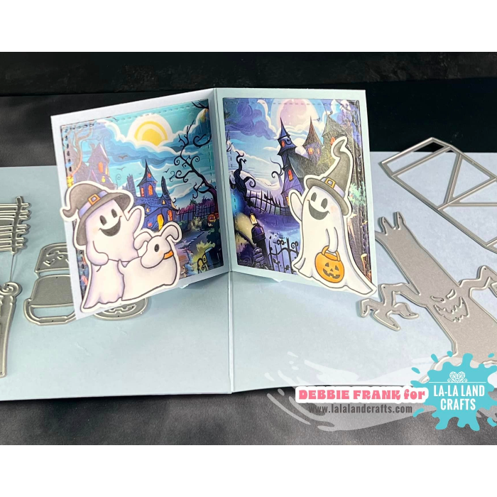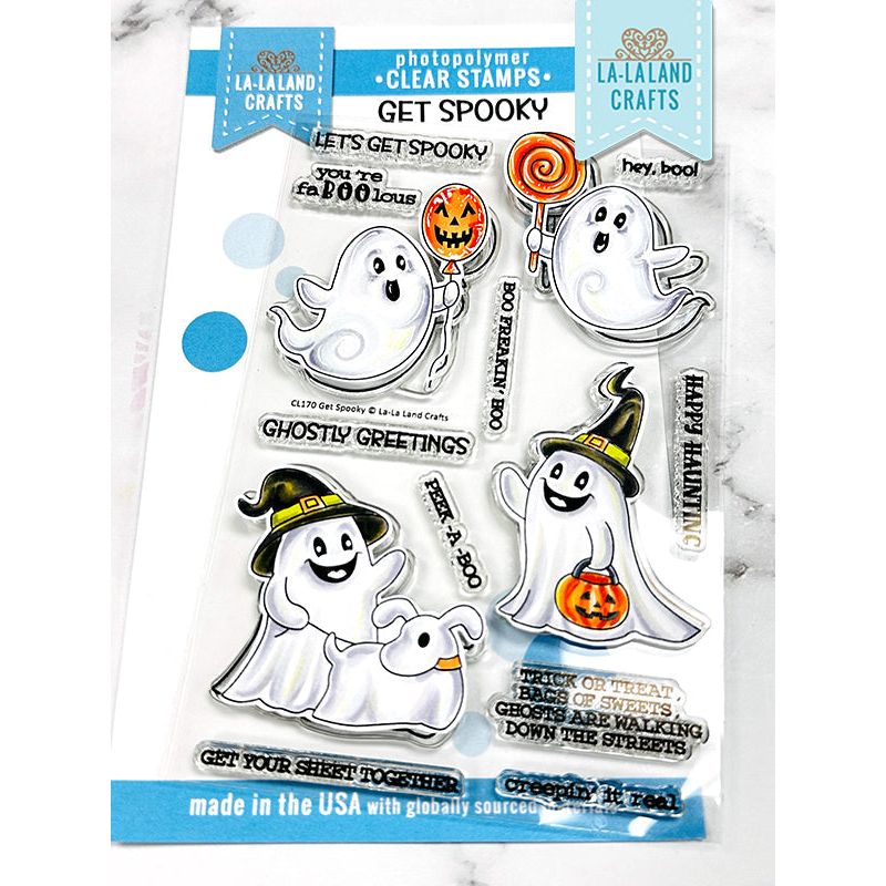The La-La Land Crafts Get Spooky Clear Stamps set is packed with spooky fun! This 4x6 inch clear stamp set includes four silly ghosts—one trick-or-treating, one flying with a balloon, one eating candy, and one walking a ghost dog. It also features 10 playful sentiments. Designed to be colored, these stamps are perfect for cardmaking, scrapbooking, planners, and other crafts. Made in the USA from high-quality photopolymer, the stamps are latex-free, non-toxic, and resistant to yellowing.