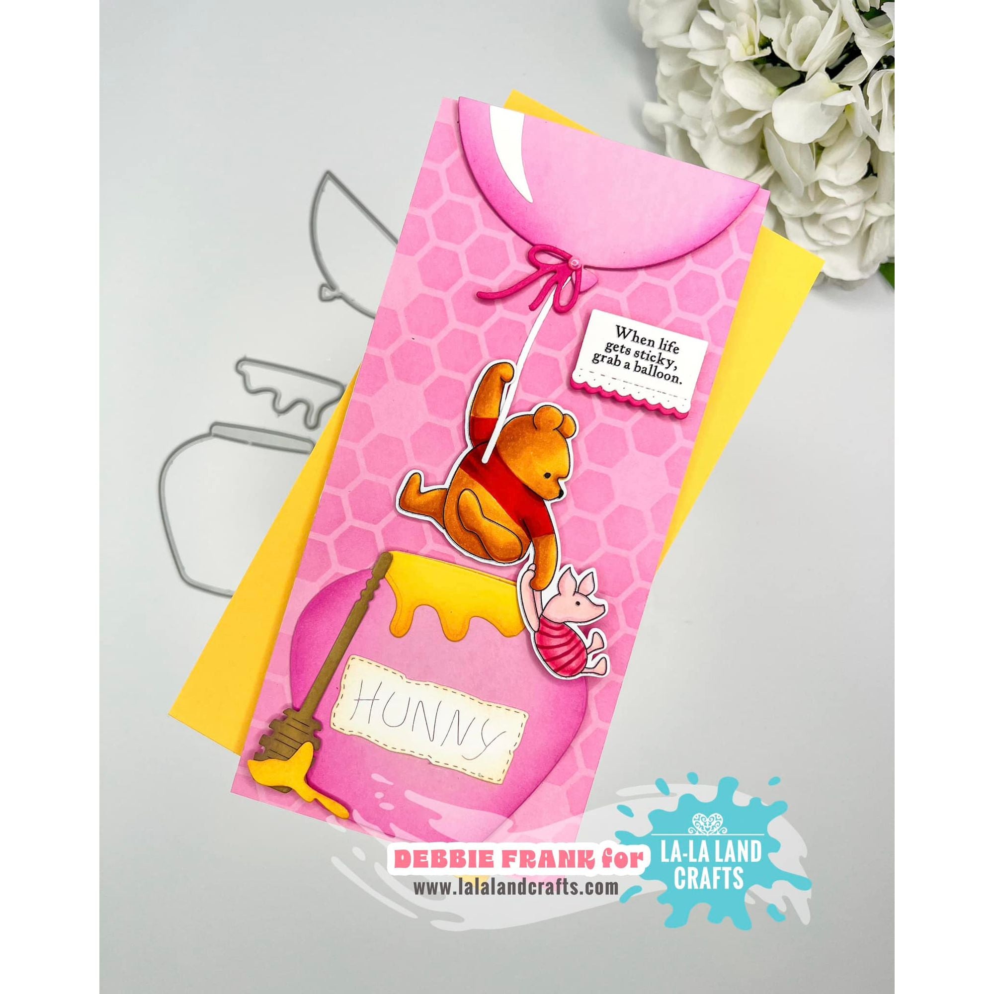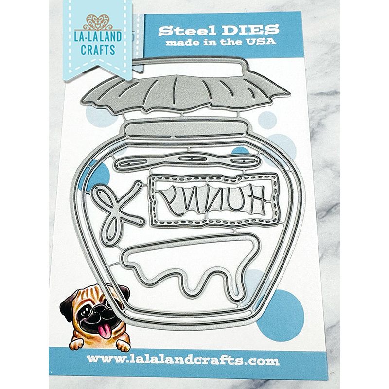 La-La Land Crafts Large Honey Pot Die set includes 8 dies to create all kinds of sweet creations. The set features a hunny jar, as Winnie the Pooh would say with an inner layer perfect for making shaker cards, a lid, a bow, honey goop, a label, and a sentiment. The outer honey pot measures approximately 3.5 x 3.25 inches and is compatible with most die cutting machines. Use it with the Honey Dipper Dies 8927 or any other Winnie the Pooh or Honey themed product from La‑La Land Crafts for even more fun. All items are sold separately.