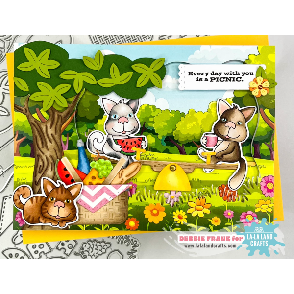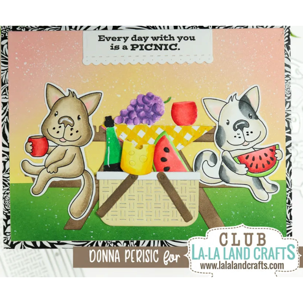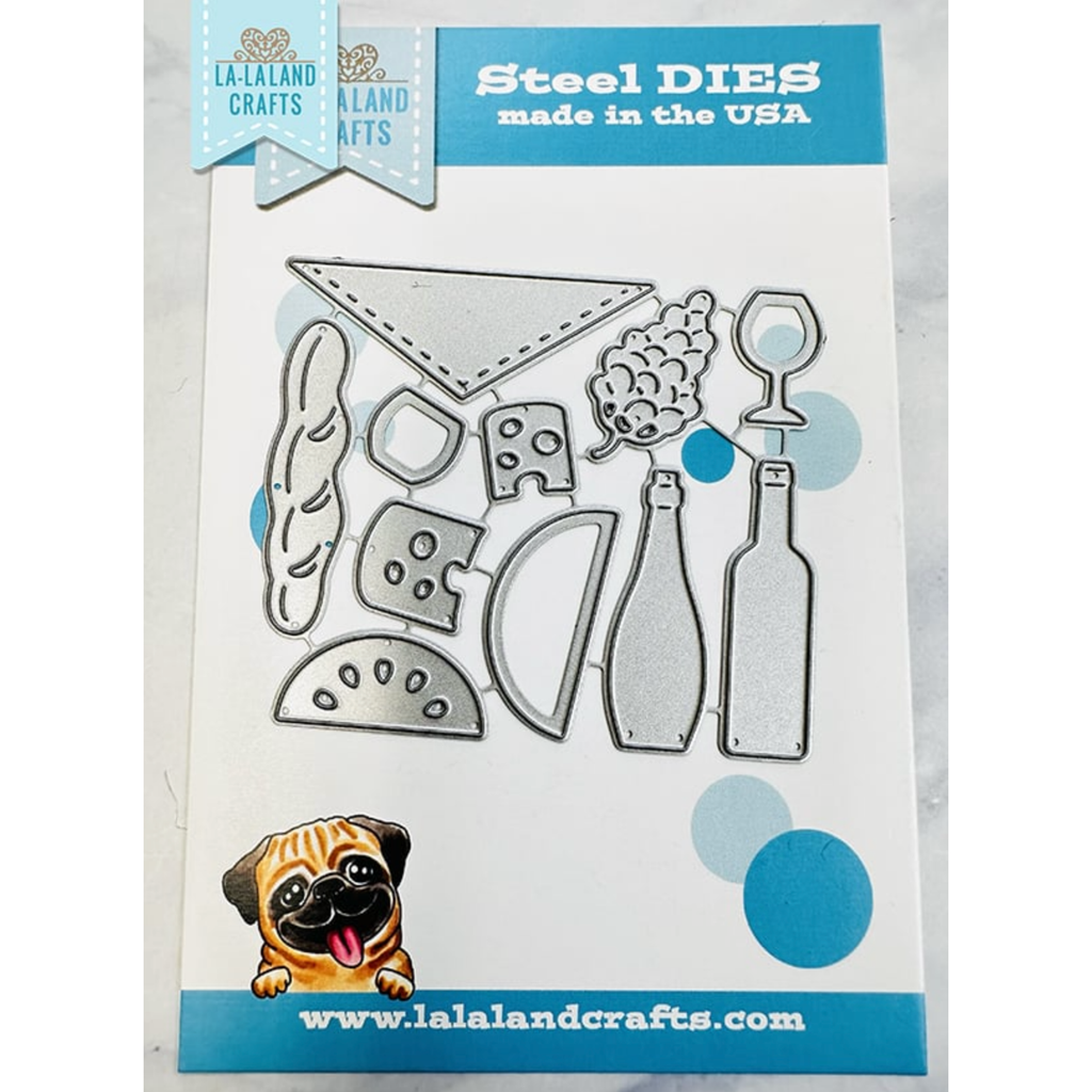 La-La Land Crafts Picnic Elements Dies set includes 11 dies to create a complete picnic meal. The set features two bottles of wine, a glass, watermelon, cheese, bread, grapes, and a napkin.