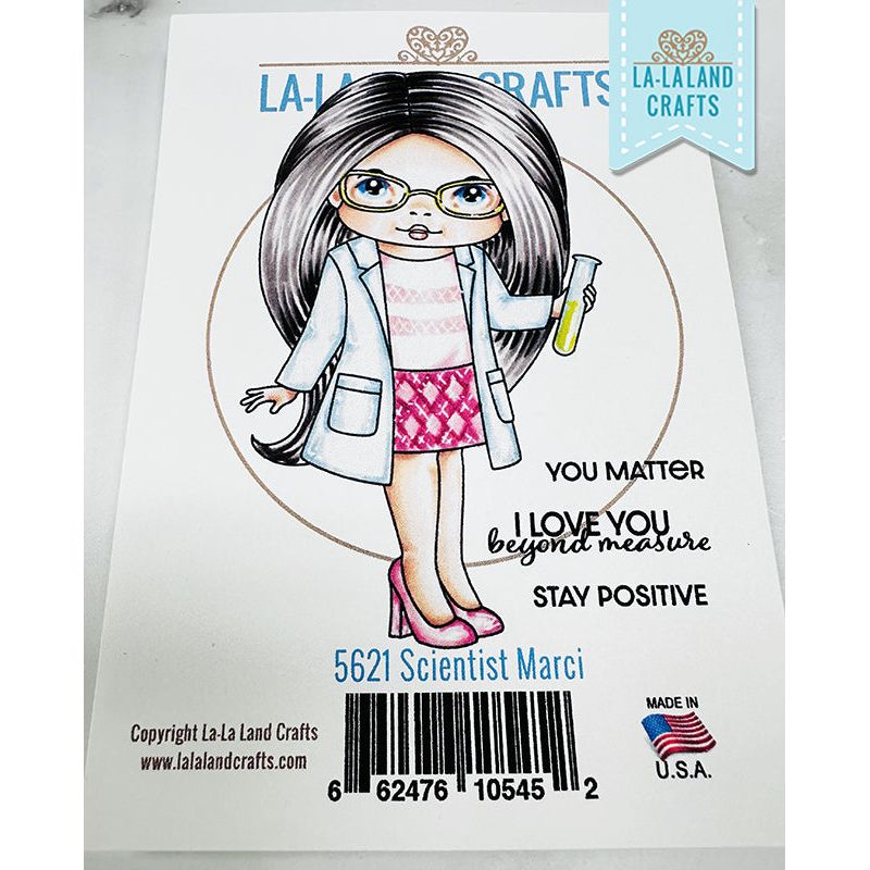 The La-La Land Crafts Scientist Marci Cling Stamp features an adorable image of Marci dressed for the lab in a lab coat, sweater, skirt, heels, and glasses, holding a beaker from her latest experiment. This charming stamp set also includes three coordinating sentiments, making it perfect for science-themed crafting projects.